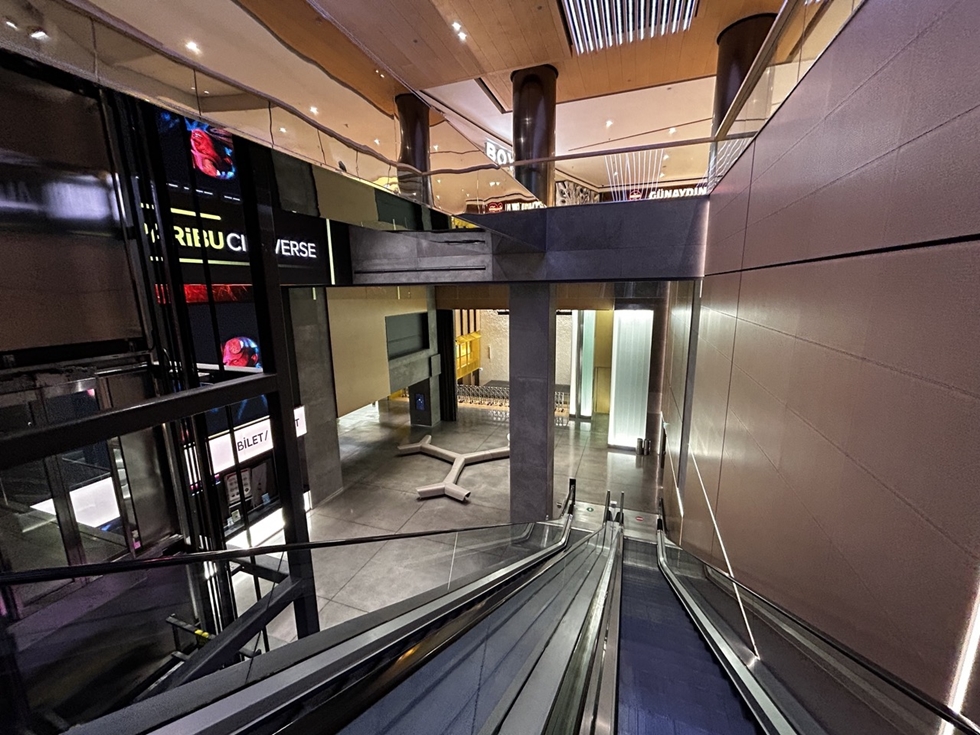 Sinema katları food court katından girilen ve girişi arka köşede kalmış, aranarak bulunan, belirgin olarak kendini göstermeyen bir alanda kalıyordu. Sadece sinema için inilen, arkada ve kuytuda kalmış bir alanın erişilebilir olması, algılanması ve insanlara bir yolculuk vadediyor olması en çok dikkat ettiğimiz noktalardan biriydi. Bu üç boyutlu boşluk ve bu boşluğun mevcut mekanlarla kurulan entegrasyonu bizim başlangıç noktamız oldu.