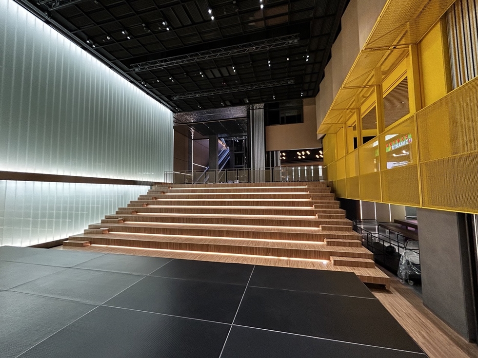 Buradaki en zorlayıcı kısımsa, bütün bölümleri birleştiren, yukarıdan aşağıya bir fuaye alanı ve bu fuaye alanına takılan ve neredeyse bütün mekanların açıldığı, etkinlik meydanı olarak tarif ettiğimiz büyük bir çukur ortaya çıktı. Bu etkinlik meydanı teleskopik tribünleriyle açılıp kapanabilen, kendi başına bir sergi alanı olabilen, bölücü panellerle kapandığı zaman tamamen kapalı bir kutu haline gelebilen, açık olduğu zaman da sürekliliği hiç bozmadan kullanılabilen ve çok sayıda etkinliğe aynı anda izin veren bir kent meydanı gibi kurgulandı. Bu meydan; (box in box sistemi ile kurulan bir tiyatro alanı) kapalı bir salon ve çocuk eğlence alanının olduğu arkadaki bölümün merkezinde yer aldı.