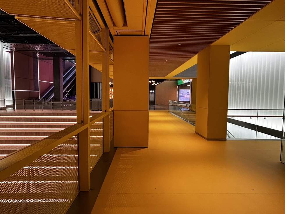 Benim annem kimya mühendisi, babam da doktorasını renk üzerine yapmış olan bir tekstil tasarımcısı. Bu sebeple her şeyin bir kimyası, dengesi ve bir oluş hali olduğunun düşünüyorum. Mekânı ortaya çıkarmanın da aslında renkleri ayarlamak ve işin kimyasını kurmak gibi düşünebiliriz. Biz orada bulunan farklı malzemelerin bir araya gelme kimyasını/ölçüsünü de ayarlıyoruz. Ne kadar sert zemin var? Ne kadar yansıtıcı yüzey var? Ne kadar olmalı? Mesela tavanda belli alanlarda dalgalı, yansıtıcı bir panel var, o panel süs olsun diye orada değil. Ancak tasarım tamamlandığında, en alt kottan yukarı baktığım zaman oradaki yansımalar ve ışık hareketleri, tasarlanmış olan mekânın algısını oluşturuyor. Örneğin sarı renk kullanımı ile bir rota oluşturduk ve projenin bütününde hissedilebiliyor. Seçilen malzemeler, malzeme dokuları, malzeme miktarı ve mekânın içindeki varlığı ile her şey birbirini tamamlamak üzere tasarlandı. Akustik malzeme tercihlerimiz de görünür yüzeylerde kullanma imkanı sağladığı için mekanda bir öge olarak çok önem kazanıyor. Görünmeyen ve arka planda kalacak bir katman ilgimizi çekmez ama mekânda belli bir kalitede çalışıyor olmasıyla önem kazanır. Görünmeyen kısımlarda başka bir malzemeye gidebiliriz de denilebilirdi ancak bir tasarımın yüzey sürekliliği aynı kalitede olduğu zaman bir bütünlük sağlanabiliyor. Bu konuda tasarım ve uygulama sürecindeki iletişim ve dil ortaklığı bu farkındalığın sürekliliği de için çok önemli bir faktör.