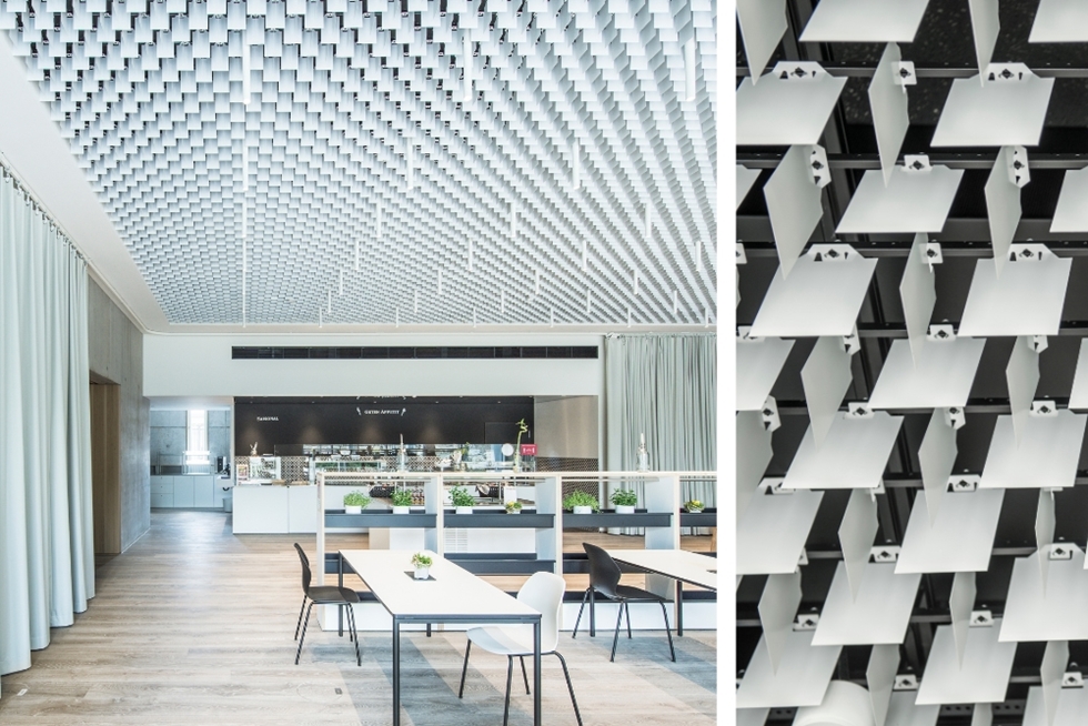 Beyaz, dik kesişen kanat profilleriyle inşa edilen bu sistem, %95’in üzerindeki açık kesit oranıyla tavanı neredeyse görünmez kılıyor. Tavana entegre edilmiş siyah düşük frekans emiciler, ses yankısını minimize ederek mekanın sosyal dinamiklerine sessizce katkı sunuyor. Tıpkı bir ses mühendisinin mekânı perde arkasından yönetmesi gibi, LIVA burada yalnızca bir yüzey değil; akustik ve ışıkla kurulan bütüncül bir tasarım dilinin taşıyıcısı.