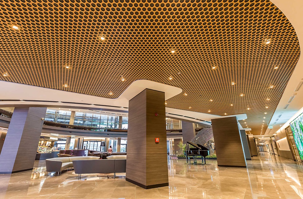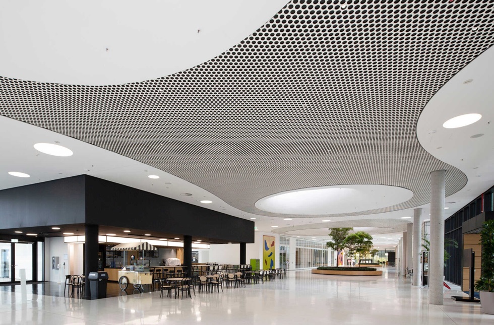 durlum LIVA açık hücreli metal tavanların bronz rengi, iç mekanın zarif havasını pekiştirirken, geniş giriş alanında lüks, sade ve etkileyici bir görünüm sunar. durlum LOOP tasarım metal tavan sistemi, tekrarlayan yuvarlak boşluklarıyla dinamik bir etki yaratarak mekâna canlılık katar. durlum PUNTEO-J60 LED aydınlatma ile mükemmel uyum sağlayan durlum LOOP metal tavan, aynı zamanda akustik yalıtımı iyileştirir. Entegre LED aydınlatmalarla desteklenen bu sistem, görsel ve fonksiyonel açıdan yüksek performans sergiler.