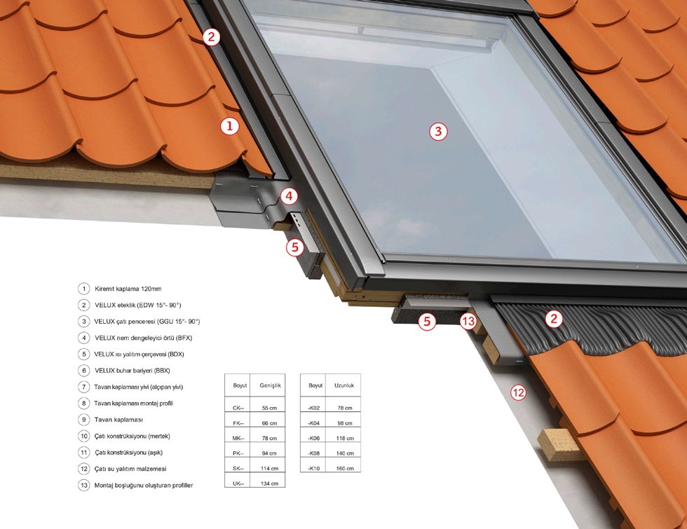 VELUX Nem Dengeleyici Örtü ile su yalıtımının ilk adımı yapılır. Ardından pencere altındaki kiremitler dizilir ve üzerine gelecek şekilde VELUX Eteklik yerleştirilir. VELUX etekliğin tüm parçaları takıldıktan sonra kalan kiremitler yerleştirilir ve VELUX Çatı Penceresinin döner camlı kısmı montelenerek işlem tamamlanır.