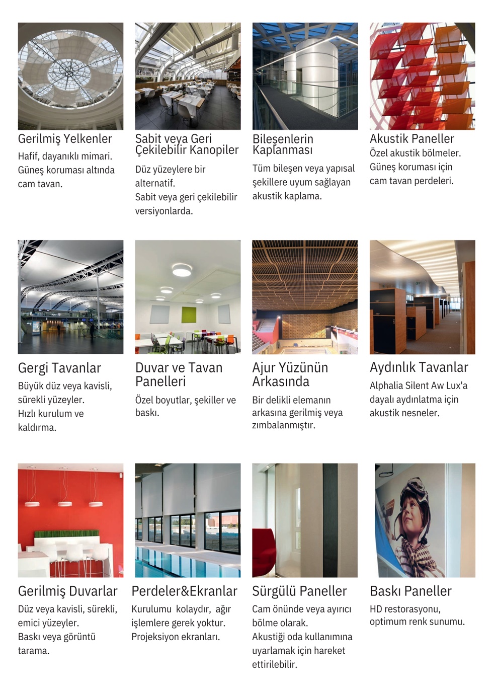 Stadyum gibi açık alanlarda rüzgara karşı dayanıklı, geniş açıklıklı akustik gergi tavanlar oluşturmak için kullanılabilirler.