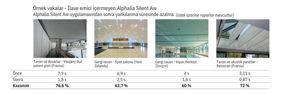 Akustik kazanım uygulama yerine, şekline, malzeme seçimine ve diğer malzemelerle bir araya gelişine göre farklılık gösterebilir. Aşağıda Alphalia Silent Aw ürünü için ölçümlerini yaptığımız bazı örnek vakaları inceleyebilirsiniz. Her bir durumda farklı bir yöntem ile akustik paneller yapıya uygulanmıştır.