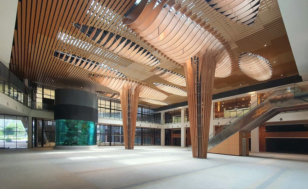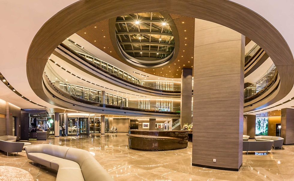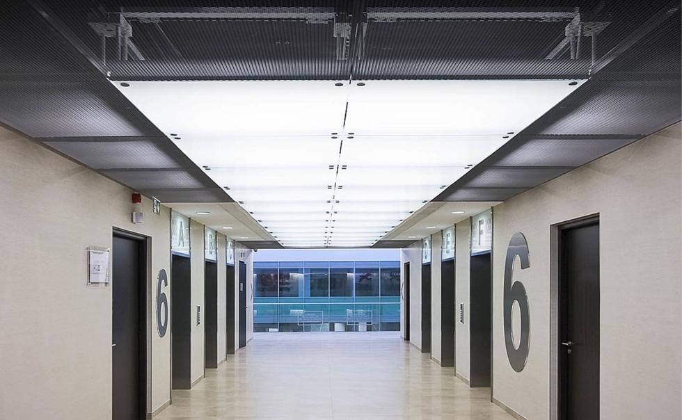Durlum'un OPEN SKY® şeffaf cam tavan sistemi, lobilerde ve koridorlarda homojen ışık dağılımı sağlar. Buna ek olarak, S4-RHOMBOS genişletilmiş metal tavan sistemi hem güvenliği hem de tasarım bütünlüğünü artırır. Bu yenilikçi çözümler, projeye estetik ve işlevsel açıdan önemli katkılar sunar.