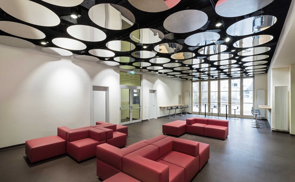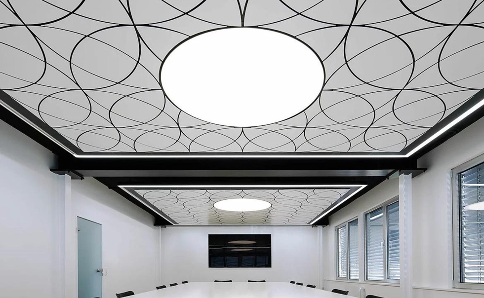 TOMEO-R kombinasyonu, özel atmosferli mekânlarda estetik bütünlük sağlar. dur-GRAPHICS baskı yöntemiyle özelleştirilebilen yüzeyler, çeşitli boyut, şekil ve renk seçenekleriyle projelerinize benzersiz bir karakter katar. Akustik işlevler, duman tahliye cihazları ve sprinkler sistemleri, görsel bütünlüğü bozmadan tavana ustalıkla entegre edilebilir. Bu kişiselleştirme imkânı, mekân tasarımına özgün bir dokunuş ekler ve estetik açıdan tatmin edici sonuçlar elde edilmesini sağlar.