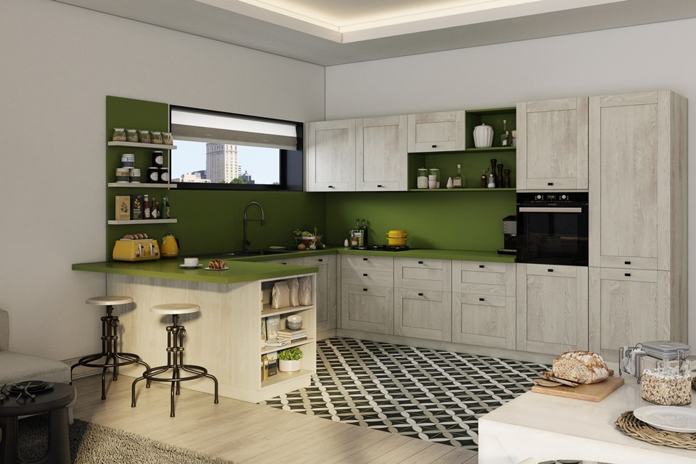 Mutfak tasarımında birden çok noktada yeşil rengin tercih edilmesi, doğa ile iç içe bir algı sunacaktır. Kahverengi, siyah, gri ve beyaz gibi nötr renkler de doğallık algısını koruyacaktır. Renk diziliminde mavi ve sarı gibi yeşile yakın renkler, tasarıma eğlenceli bir enerji katacaktır.