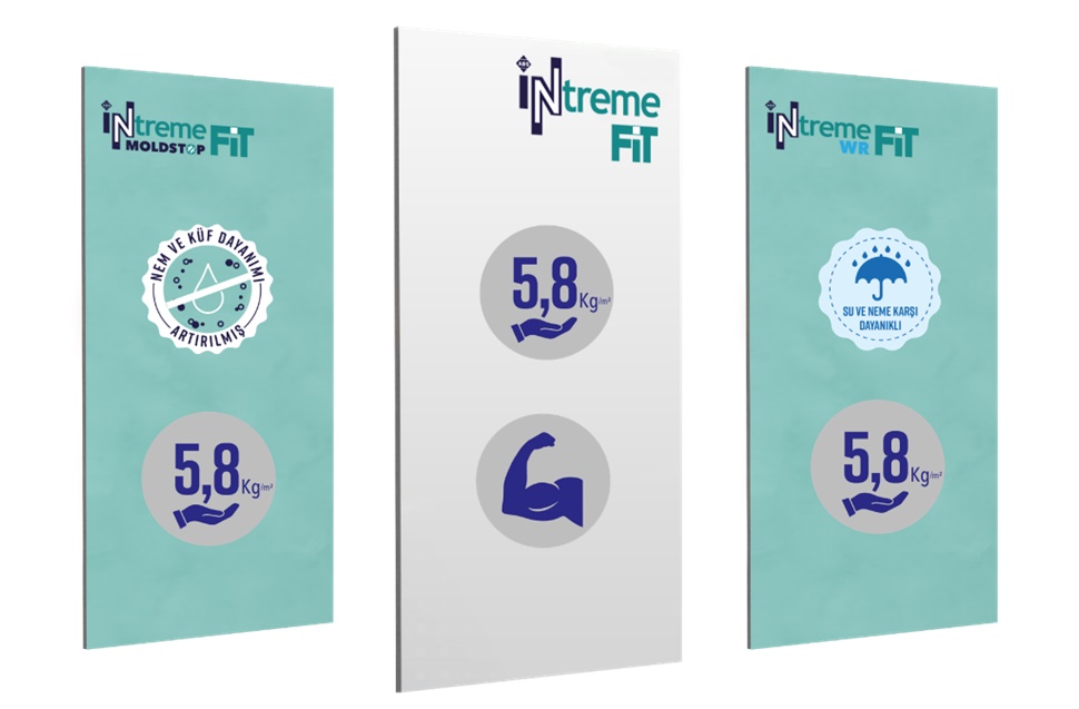 Tüm iç mekân kuru duvar sitemlerinde; su, küf ve neme dayanıklılık gerektiren tüm sistemlerde 5,8 kg/m2 ağırlığıyla Türkiye’nin en hafif iç mekân alçı plakası Intreme FIT uygulamalarıyla karşılaşabilirsiniz. Islak hacimli alanlarda su ve nem dayanımı için Intreme FIT WR, nem ve küf dayanımı için ise Intreme FIT Moldstop MWR ürünleri ideal seçimlerdir.