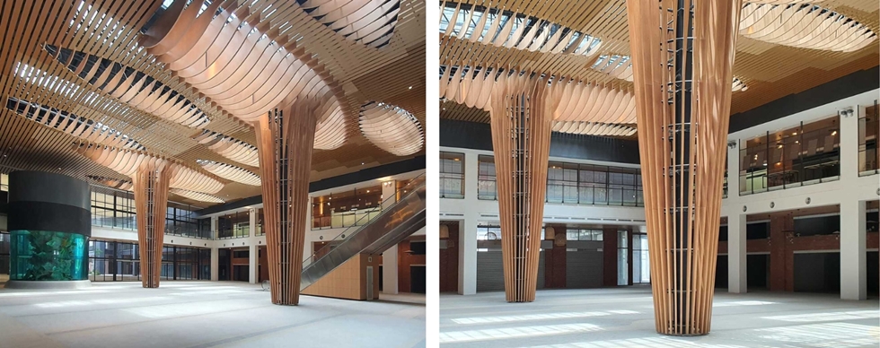 Ayrıca, tavan tasarımındaki bulut formu efekti ile de hem iç mekana daha fazla doğal ışık alınmış, hem de tropikal denizcilik sembolize edilmiş olur. Her biri farklı formda üretilerek, parametrik tasarım öğesi görevi gören tavan panelleri, iç mekan tasarımının sanatsal ifadesini derinleştirmeye katkı sağlamıştır.