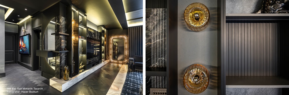 MM Evi için, evin duvar kaplamalarını örnek verebiliriz. Salt’ın imza uygulaması olan yaşam alanlarının duvarlarında; dekoratif boya, duvar kağıdı, lake ahşap panel, doğal ahşap kaplama, kök ahşap kaplama ve mermer katmanlarının özenle düzenlenmiş̧ kompozisyonu ışığın derinlik kattığı dekoratif objelerle de desteklenerek bir araya geliyor. Yüzeyleri kotları kullanarak farklı malzemeler ve temiz bitişlerle katmanlaştırıp derinleştirerek mekanları daha tanımlı hale getiriyoruz.