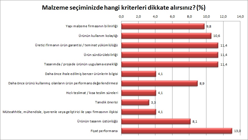 Mimarların malzeme seçiminde göz önüne aldıkları pek çok kriter bulunuyor elbette. Buna ilişkin sorduğumuz soruda %13 ile fiyat performansı en önemli kriter olarak öne çıkıyor. Bunun yanında üretici firmanın ürün garantisi / teminat yükümlülüğü ile birlikte ürünün sürdürülebilirliği ve tasarımda / projede ürünün uygulama esnekliği malzeme tercihinde etki eden diğer önemli özellikler olarak vurgulanıyor.