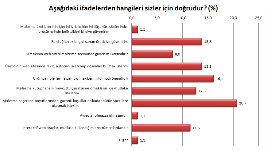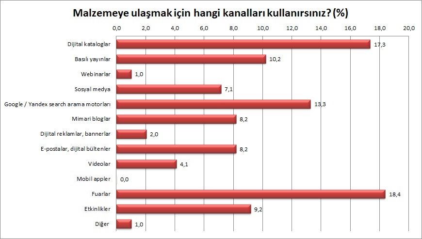 Fuarlar yapı malzeme firmaları ve mimarlar için her zaman önemli olmuştur. Anket sonuçlarından görüldüğü kadarı ile bu önem halen devam ediyor. Önümüzdeki günlerde belki de sanal fuarlarla bu durum daha da öne çıkacak gibi görünüyor. Malzemeye ulaşmada diğer bir tercih edilen kanal ise dijital kataloglar. Bu durum başta bahsettiğimiz dijital stratejileri benimseme yönünde adım atmanın önemine işaret ediyor.