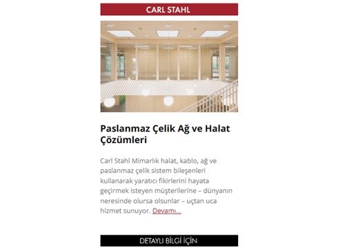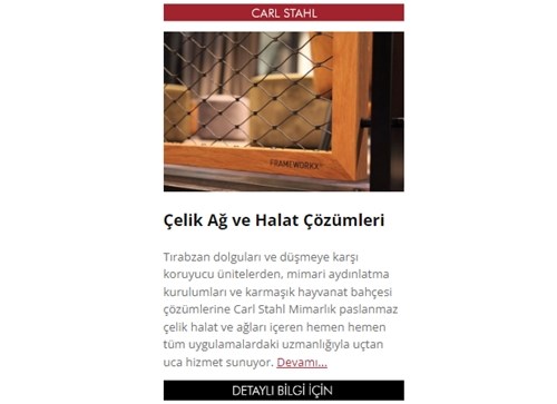 Tırabzan dolguları ve düşmeye karşı koruyucu ünitelerden mimari aydınlatma kurulumları ve karmaşık hayvanat bahçesi çözümlerine Carl Stahl Mimarlık paslanmaz çelik halat ve ağları içeren hemen hemen tüm uygulamalarda uzmandır. 1880’den beri ilk zamanlarda tarımda kullanılan doğal liften imal halatlar ve günümüzde de çelik halat ve çok ağır yüklerin kaldırma ekipmanları sağlayıcısı olarak Carl Stahl sektörün liderleri arasında olmuştur. Carl Stahl’ın “mimari” bölümü doksanlı yıllarda geleneksel çatısının altında kurulmuştur. Danışmanlık ve yapısal hesaplamaları kullanarak planlamadan üretim ve kuruluma Carl Stahl Mimarlık halat, kablo, ağ ve paslanmaz çelik sistem bileşenleri kullanarak yaratıcı fikirlerini hayata geçirmek isteyen müşterilerine – dünyanın neresinde olursa olsunlar – uçtan uca hizmet sunar.
