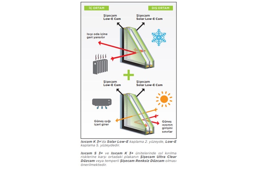 • Temperable Solar Low-E Glass provides heat and solar control and safety. This additional feature can only be added to Isıcam S, Isıcam S 3+ and Isıcam K, Isıcam K 3+ products.