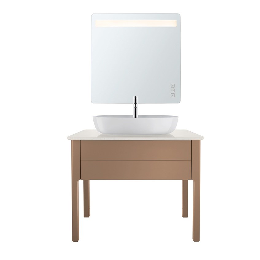 - Luv's elegant design is also reflected in the matching mirror models, which are now larger and have more features. In addition to the three existing width options (500, 1200, 1600 mm), a width of 800 mm has been added to match the new washbasin cabinet size. In the future, all Luv mirrors will be available in 800 or 1200 mm sizes. The new switch-on function for the heated mirror and colored light, controlled by the non-contact control panel, allows continuous adjustment of the light color for the upper light area and ambient lighting.