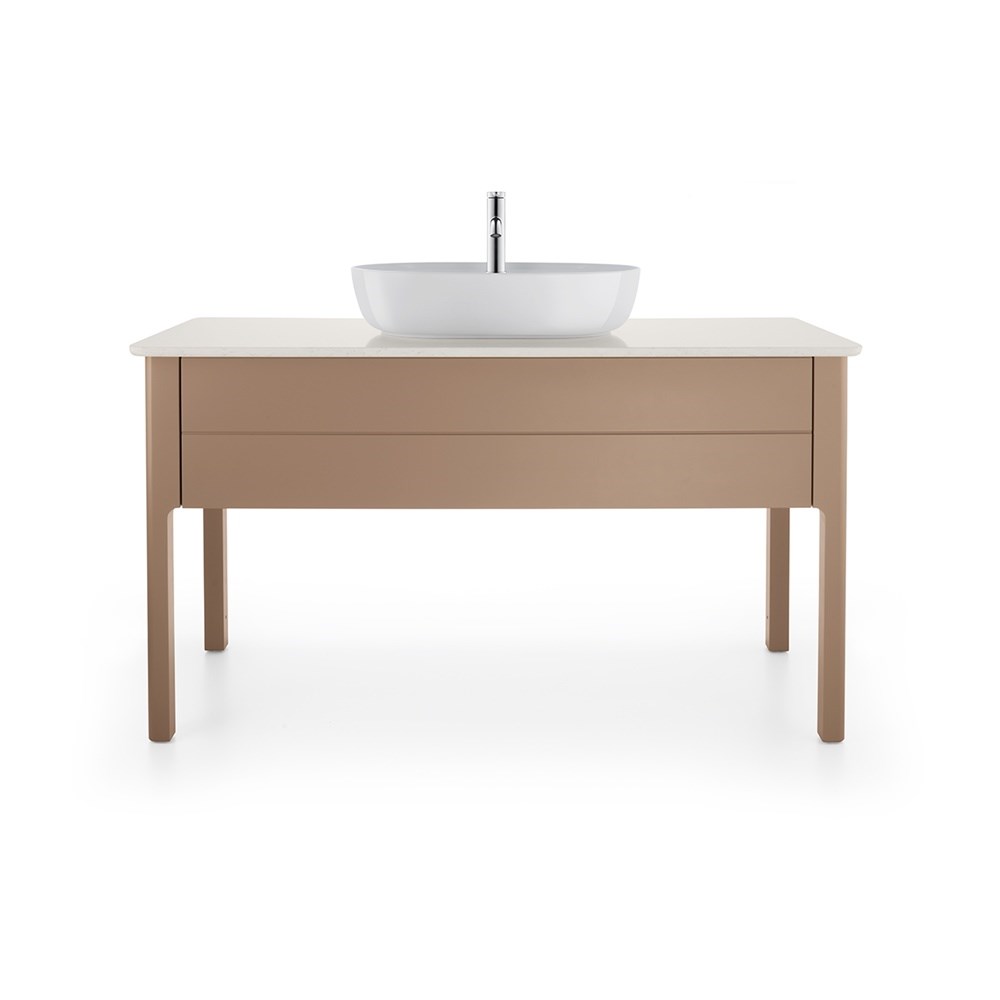 While the washbasin unit can be arranged according to personal tastes with four different console surfaces made of quartz or solid wood, it creates a feeling of calmness that forms the essence of the modest elegance of the series together with soft earth tones.