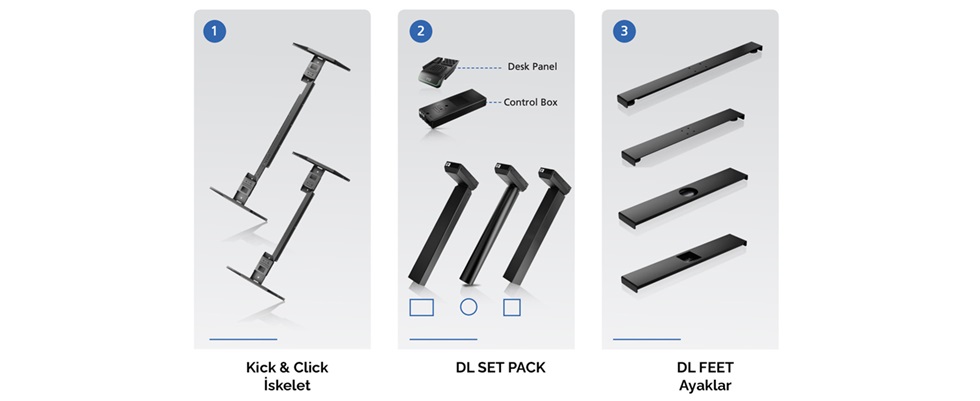DL Set Pack: The DL Set Pack is a bundled set that includes all the necessary electrical components for the user. This set comprises two lifting columns, a table controller, a control box, and the required cables for designing a customizable workspace. It offers various design options with three color choices. Additionally, the DL Set Pack includes different profiles for each component, including round, square, and rectangular shapes.
