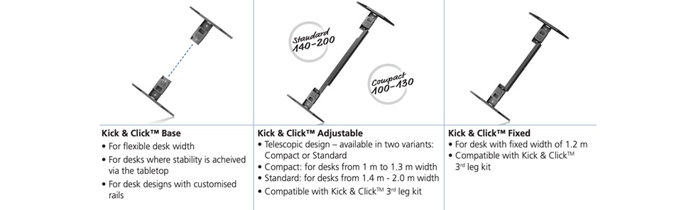 Kick & Click Top Desk Frame: With the Kick & Click top scaffolding system, which does not require any tools or screws during installation, you can easily install it on a tabletop surface of your choice. It is available in different versions and sizes so that users can customize it according to their needs. Kick & Click, which you can customize according to your needs, is offered to users with various options such as fixed, adjustable compact, adjustable standard, and base. When choosing Kick & Click, it is recommended that you consider the dimensions of the table surface you will need in your workspace as a basis. The fixed version can be used for tables with a width of 120 cm, while the adjustable compact version can be preferred for tables with a width between 100-130 cm. The adjustable standard option can be used for desks with a table surface width of 140 to 200 cm. The Base option can be preferred for more flexible table surfaces.