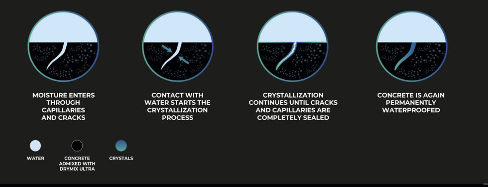 Drykos' products are designed to improve the water resistance of concrete. DRYMIX ULTRA is a key component in this system and is used for primary waterproofing. This additive uses advanced crystallized technology to improve the water resistance of concrete.