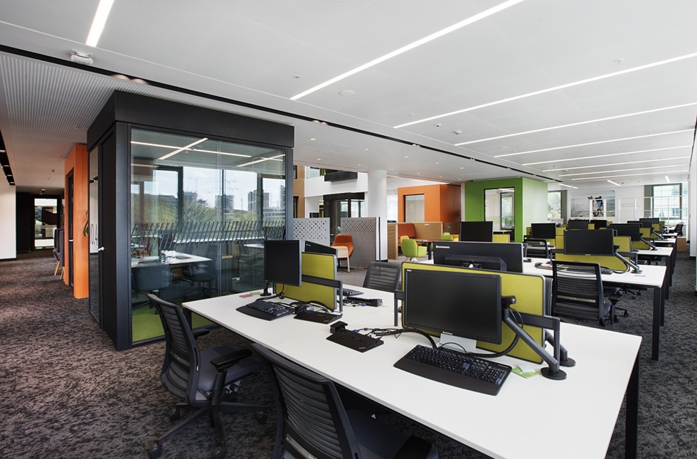 Flexibility and Acoustic Comfort in Open Workspaces: The office layout features a spatial organization that aligns with today's dynamic business needs. Acoustic panels separate individual workstations to maintain focus, while the open floor plan promotes team collaboration. Glass-partitioned, semi-private meeting areas create seamless transitions, enabling employees to work effectively both independently and in groups.