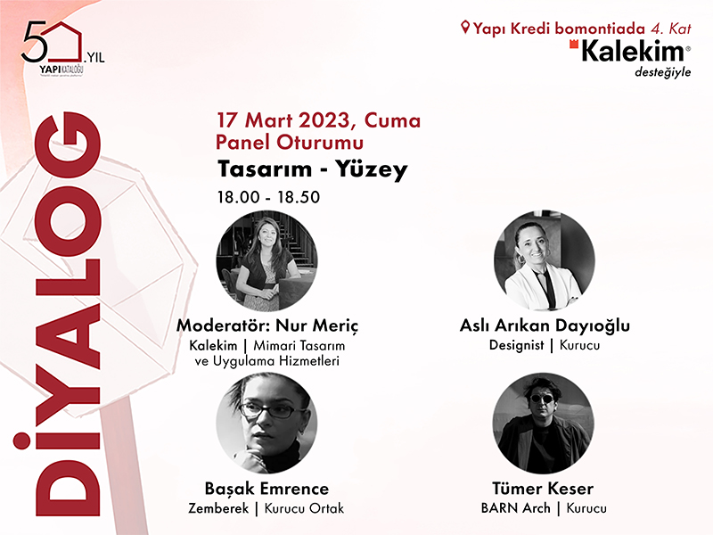 Diyalog etkinliği kapsamında Kalekim’in desteğiyle 17 Mart 2023 Cuma günü saat 18.00-18.50 arasında gerçekleştirilecek ve Nur Meriç’in moderatörlüğünde Aslı Arıkan Dayıoğlu, Başak Emrence ile Tümer Keser’in panelist olarak yer alacağı Tasarım - Yüzey başlıklı panele davetlisiniz!