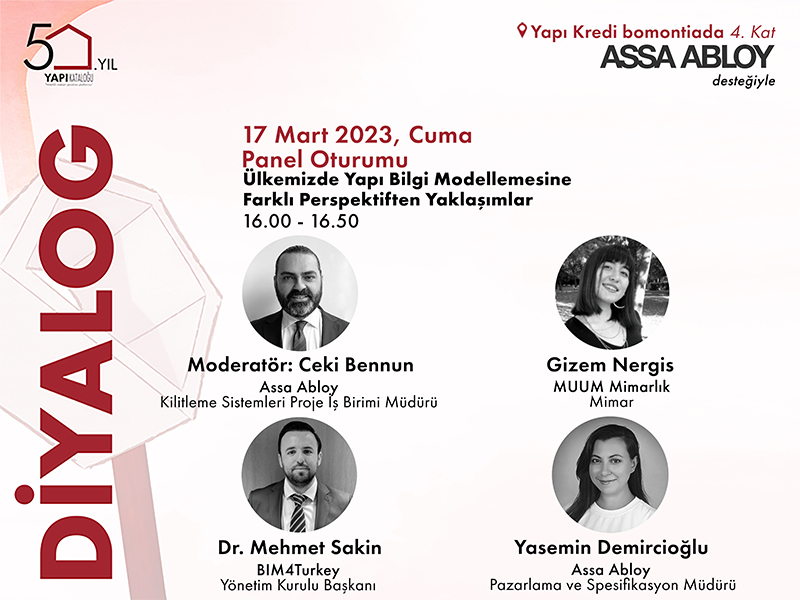 Diyalog etkinliği kapsamında Assa Abloy’un desteğiyle 17 Mart 2023 Cuma günü saat 16.00-16.50 arasında gerçekleştirilecek ve Ceki Bennun’un moderatörlüğünde Gizem Nergis, Dr Mehmet Sakin ile Yasemin Demircioğlu’nun panelist olarak yer alacağı Ülkemizde Yapı Bilgi Modellemesine Farklı Perspektifler başlıklı panele davetlisiniz!