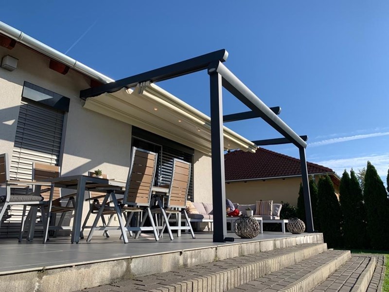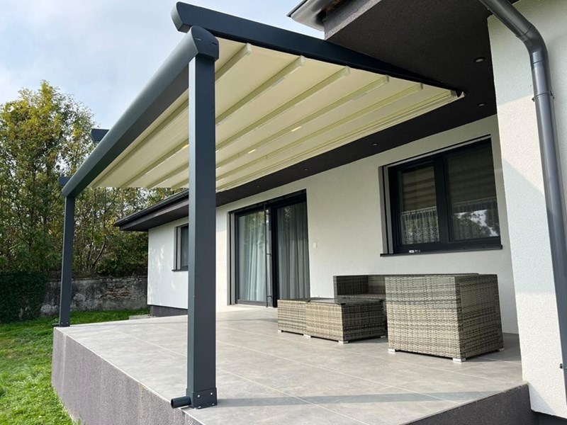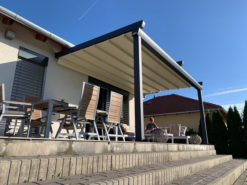 Pergola Alu Elegant is the elegant and durable pergola awning system designed for outdoor living. A functional and highly efficient option from the Pergola Alu collection, ideal for those wishing to create an attractive space in their garden or terrace. Elegant is designed to meet all the stylistic and structural requirements you may have to build your ideal outdoor space. It is a retractable pergola awning system designed for outdoor use, aiming to create a comfortable, lasting space and protect users from the sun, rain and wind. In addition, with specifically designed custom aluminum guides integrated into the structure, Pergola Alu provides high resistance along with a quiet and fast performance. Owing to its special sunshade fabric, the system provides high protection from the sun, rain and wind, giving you the opportunity to make the most of outdoor areas such as gardens, balconies, verandas and terraces. Pergola Alu’s shading system can be integrated with various covering systems and it is also possible to create a fully enclosed area.
