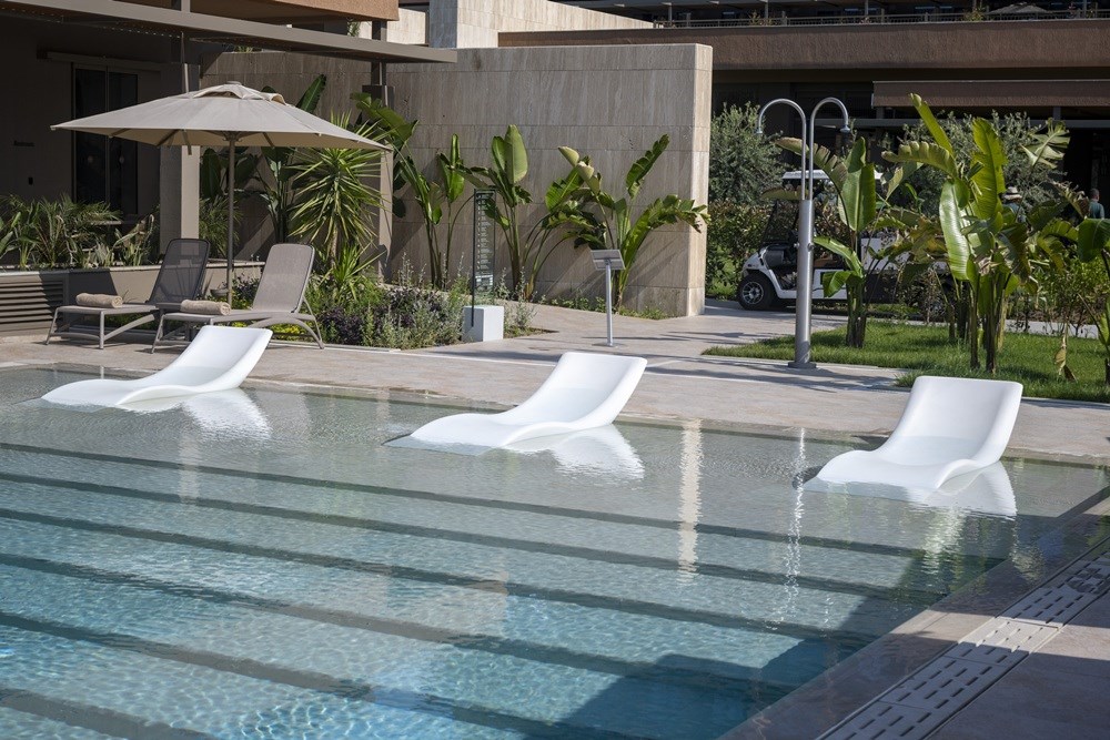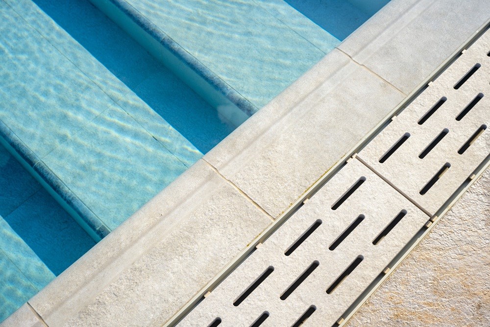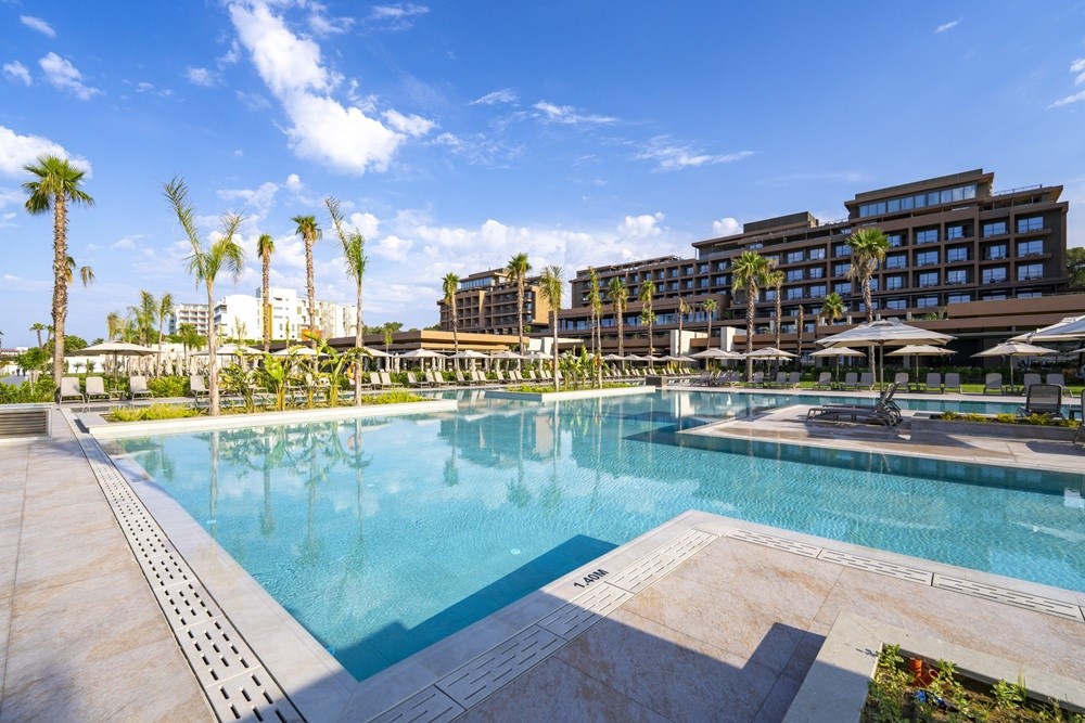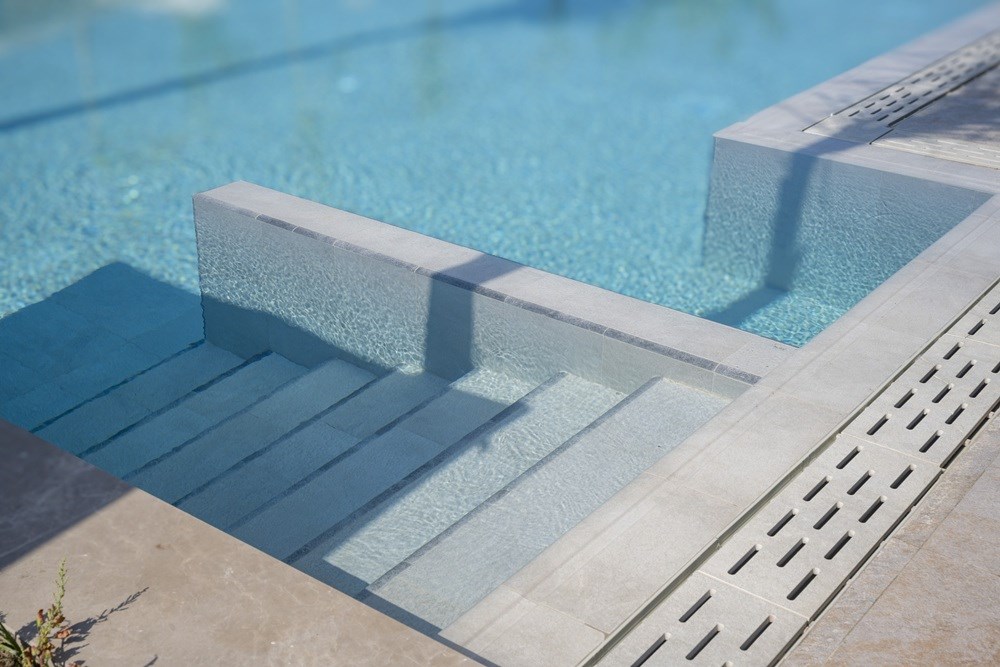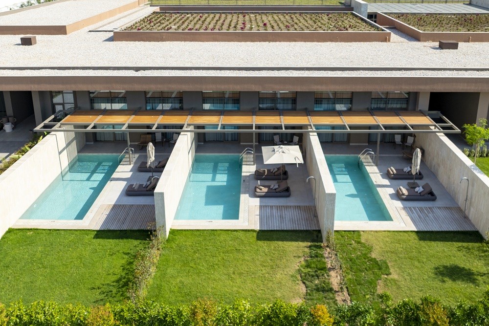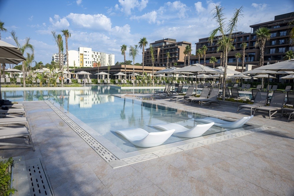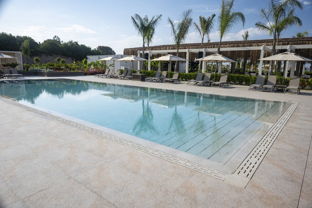 Otelin yüzme havuzu, Serapool’un estetik ve dayanıklılığı bir araya getiren Pool Garden Beige porselen karoları ile tasarlandı. Projede, içbükey ve dışbükey parçalar, monoblok ızgaralar, köşe elemanları, tutamaklar ve rakam yazıları kullanılarak hem fonksiyonel hem de görsel açıdan bütüncül bir havuz tasarımı ortaya kondu.