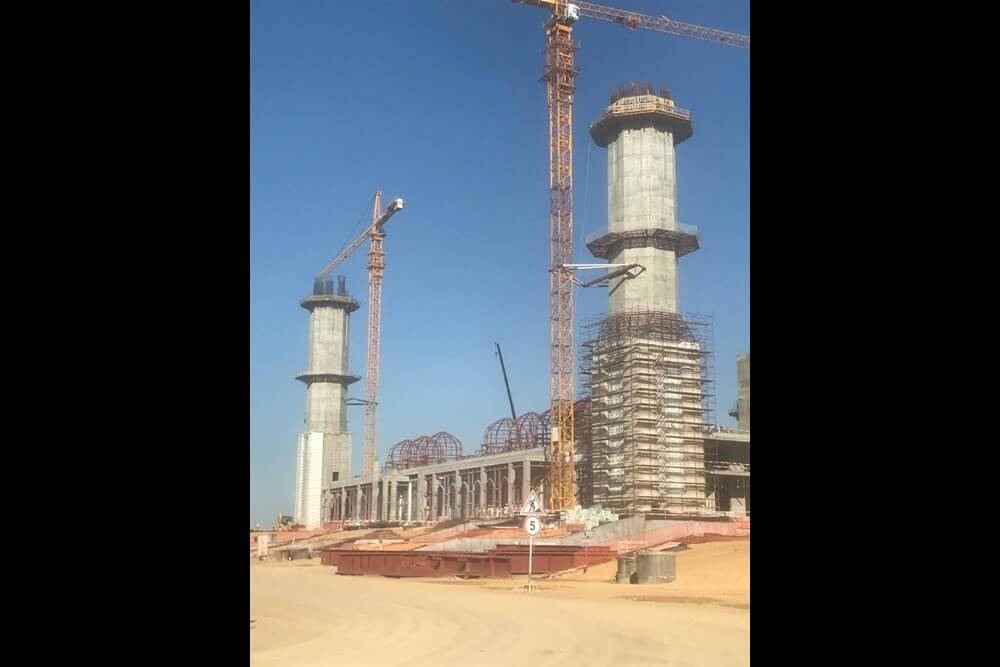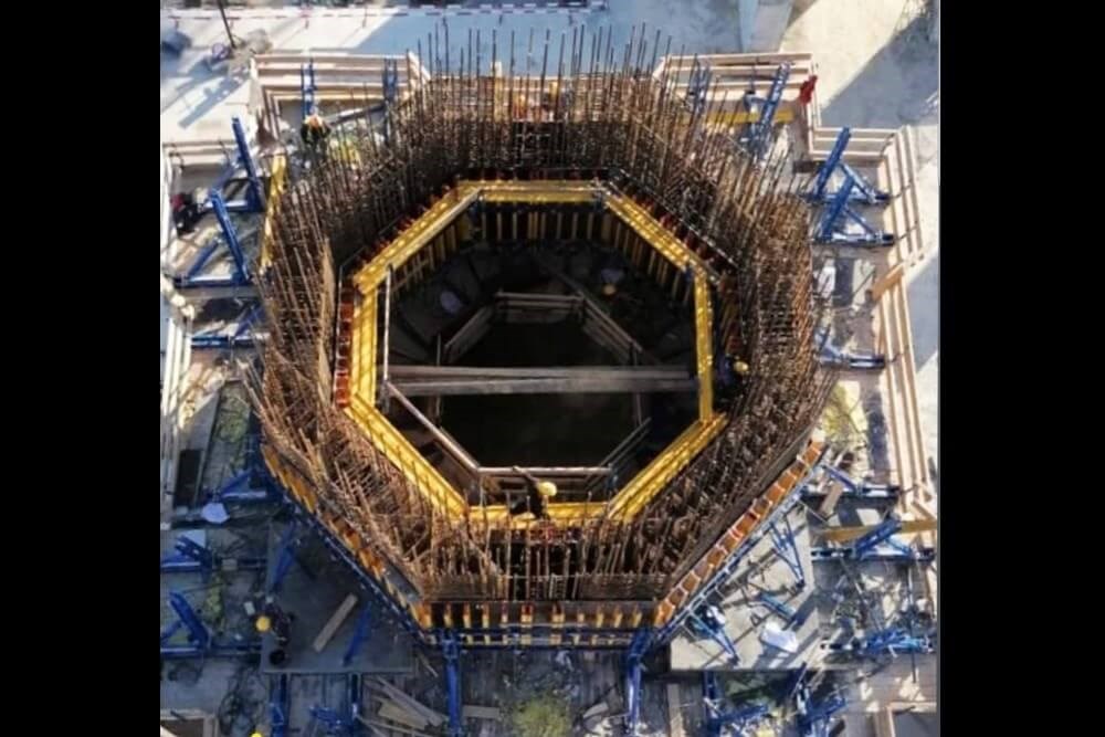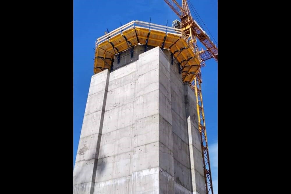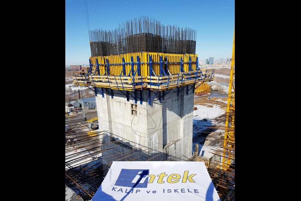 The mosque project of "Symbol International Investment", located in Nur-Sultan city of Kazakhstan, consists of 3 main parts: the field, haram and minarets. The building, which is the largest mosque in Central Asia, has 4 minarets and each minaret is 135 meters high. In addition, the building includes a closed parking lot with a capacity of 3500 cars, a VIP area, a prayer hall and ablutions. İNTEVA wooden beam curtain-column formwork system was used for the minaret curtains. As the minarets rise, an optimum solution has been provided for the differences in curtain sizes. The Climbing Console 240 HR system was used for the outer wall formwork of the minaret, and the Climbing Console 150A system was used for the inner wall formwork. One of the 4 minarets is named as touristic minaret. Stairs and elevators rise in this minaret, and a special solution has been applied for interior curtains. Instead of using climbing consoles, a shaft platform system was used on the inner bulkheads since the space was not sufficient. Shaft platform beams are designed to create a platform where curtain molds will sit in elevator shafts and workers can work safely in this area.