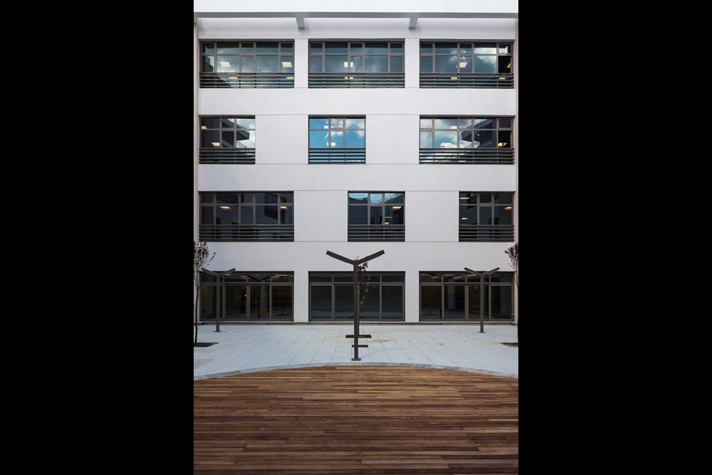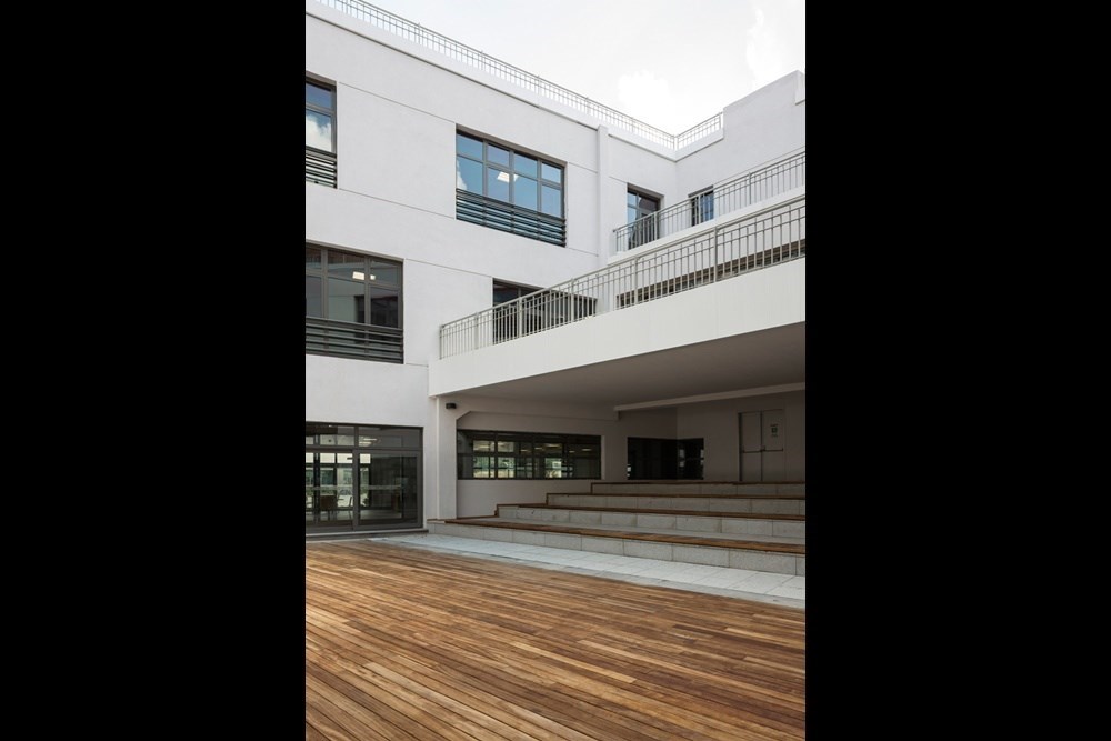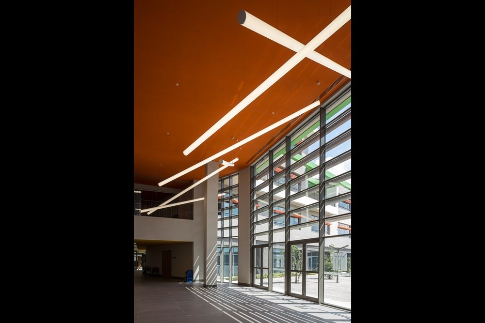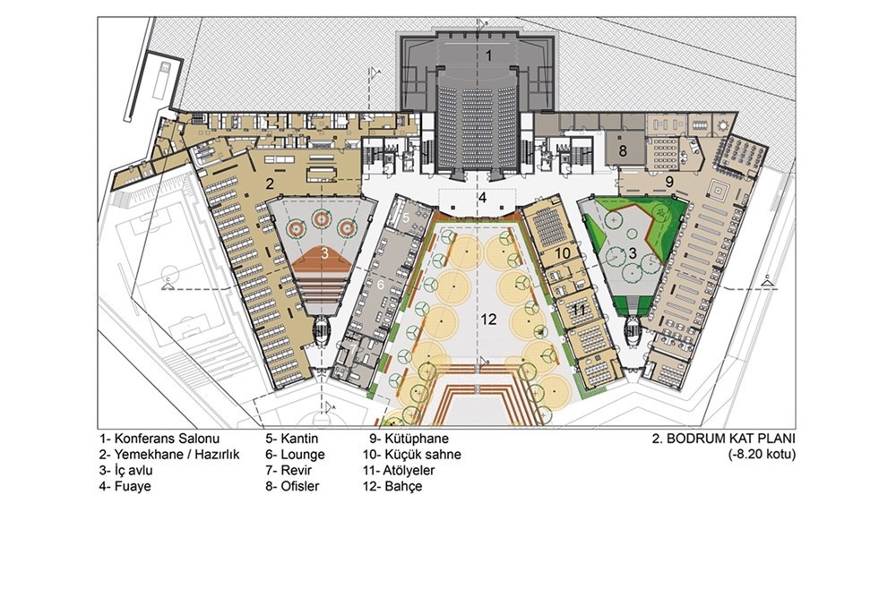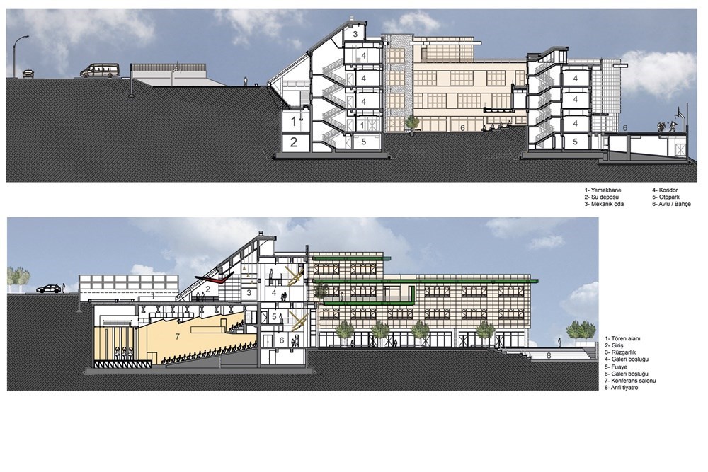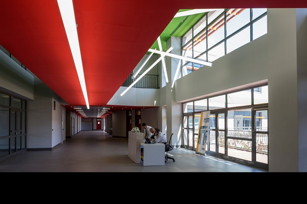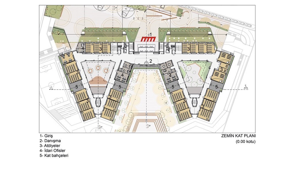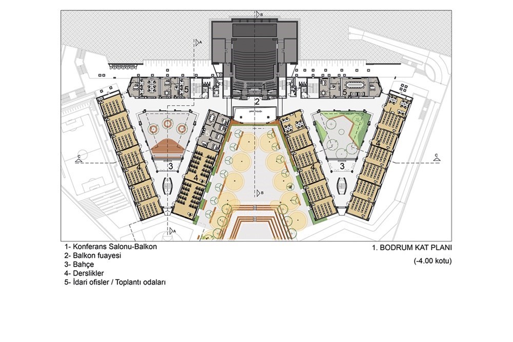 SEV Primary School and High School Campus Project located in the Nişantepe district of Istanbul, is positioned on a sloped plot of land where the buildings are on two adjacent parcels. The buildings have been arranged on 3 different elevations, utilizing the sloped aspect of the topography, and such have been enriched with gardens connecting to each other through platforms. The ceremonial ground on the wide plateau has been organized at the highest elevation. At the middle elevation the classrooms and skylight gardens were located around the triangular and wide internal yards.The main garden area where the dining hall and the conference hall are leads the lowest elevation. Both buildings are able to receive sunlight at all spots, thanks to internal yards, spacious floor gardens and luminaries. “Sustainability” has been the most important design criterion of the Project.