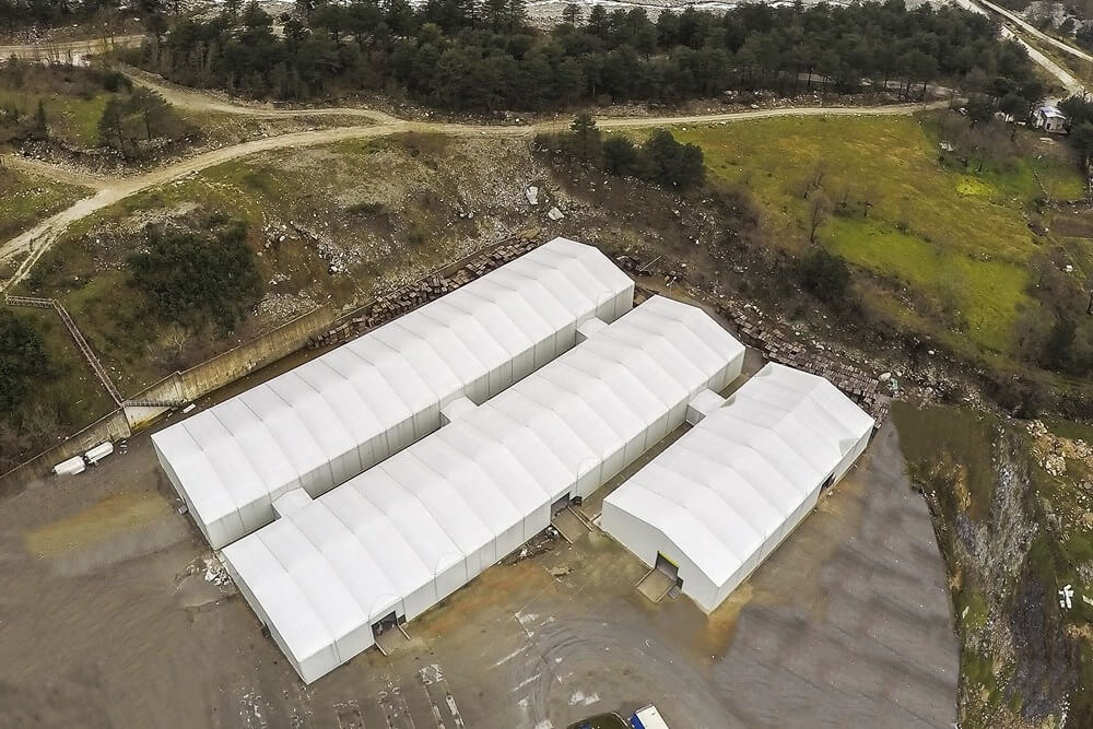 RÖDER T-Line Series Industrial Tent Systems were preferred at Erikli Nestle Water Manufacturing Facilities. The tent system, which was built with steel scissor construction for storage purposes, was established on a total area of 5800 m² in two facilities close to each other in Bursa. The column-free, clean-span building has a side height of 6.20 meters. The transitions between the buildings are provided by tunnel tent systems with aluminum construction.