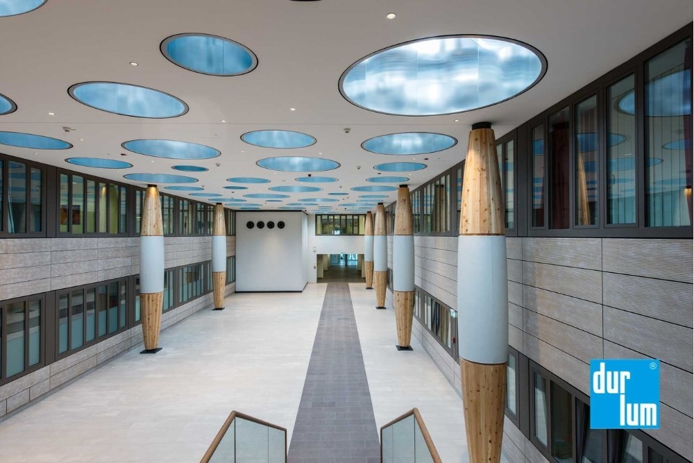 The renovation project by Ludes Architecture focused on optimizing the functionality of the main corridor area while maximizing the use of natural light. By thoughtfully integrating natural materials and innovative lighting solutions, the project achieved both aesthetic excellence and significant energy efficiency. The installation of durlum's LIGHT PIPE Daylighting systems (49 units) enables optimal natural light harvesting while effectively preventing heat accumulation. Advanced Fresnel diffusers positioned at the upper terminus of these systems ensure homogeneous light distribution, creating a natural, eye-friendly indoor environment. The anodized aluminum lighting systems provide an elegant contrast to the predominantly brown interior palette.