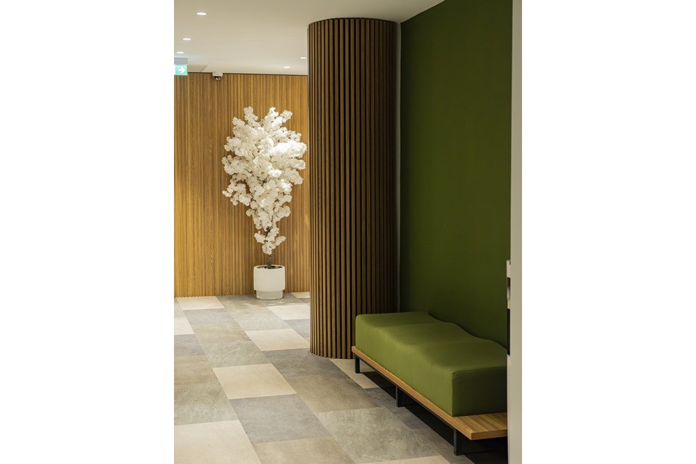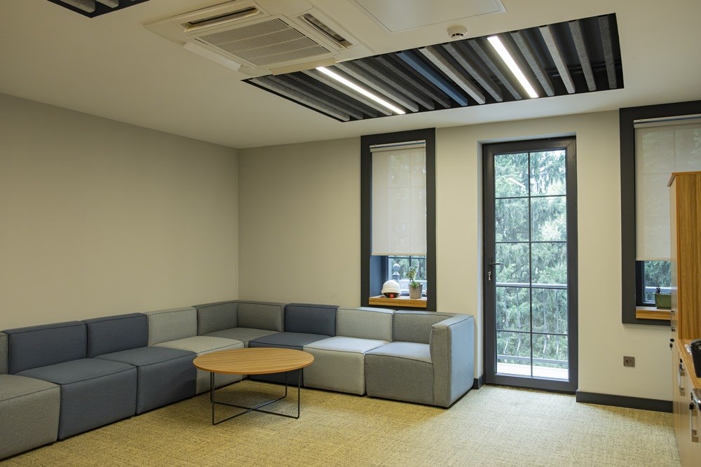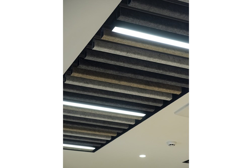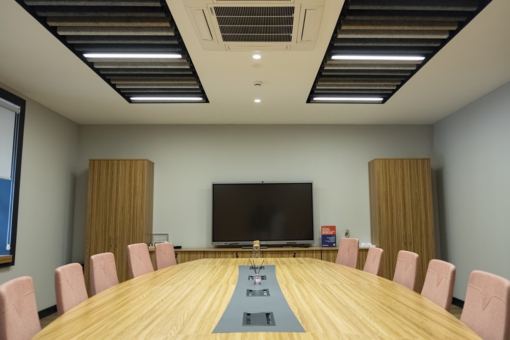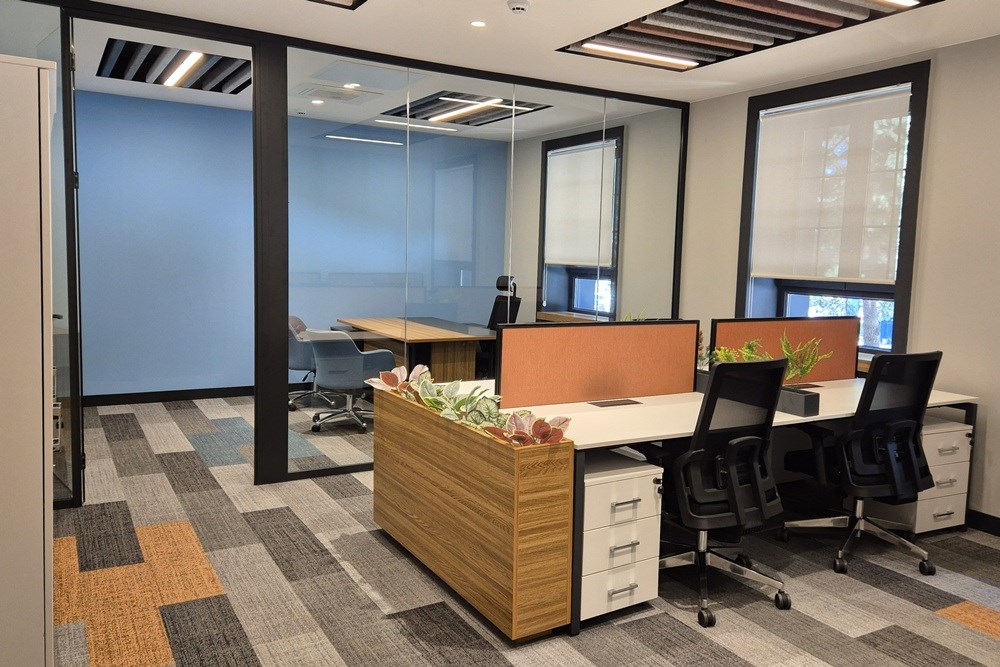 Projede Mod Tasarım'ın Fileto Çalışma Masaları, U Baffle Akustik Tavan Paneli, Naturel Meşe Ahşap Çıtalı Duvar Paneli ve Elips Toplantı Masası ürünleri ile Anıl Zemin'in AZM Pearl Lino Karo Halıları ve AZM Pearl ECO LVT Vinil Zemin Kaplamaları kullanılmıştır.