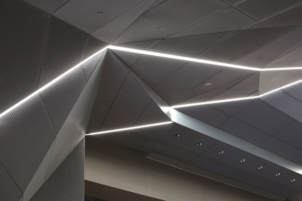 The impact of Durlum's MESH expanded metal ceilings and OMEGA 63 LED lighting channels on the interior design project is clear. Their innovative, modern, and adaptable design significantly contributes to the creative execution.
