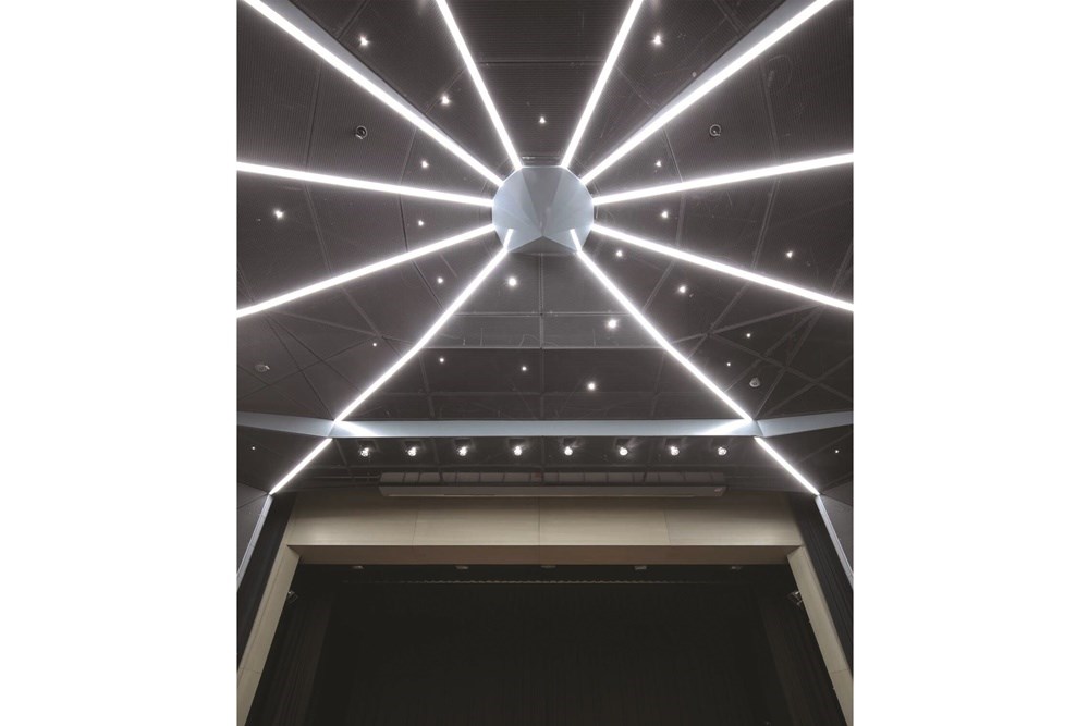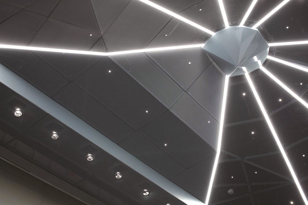 Lighting was a key aspect in this renovation project. The grid lighting was replaced with OMEGA 63 LED lighting channels, which span the ceiling like a spider's web. These dimmable lights, some of which also serve as emergency lighting, are adaptable to any situation. They do more than just provide essential lighting; they also contribute to the overall design aesthetic as these luminaire channels form the supporting profile of the MESH expanded metal ceiling's sub-frame.