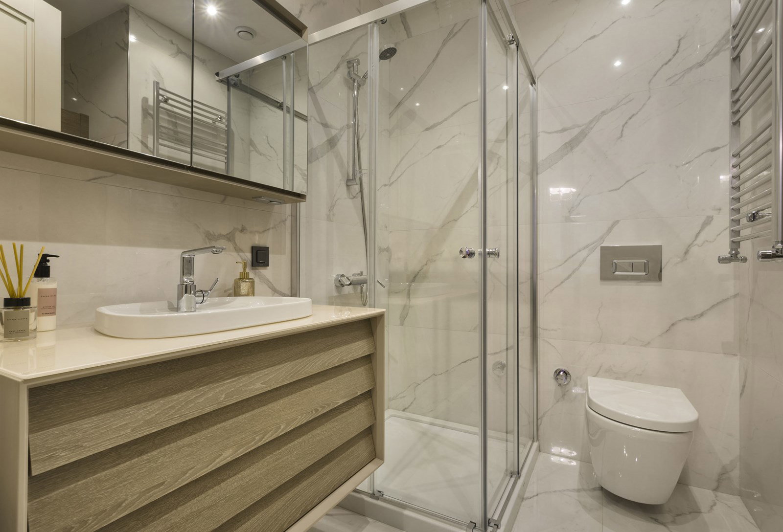 Projede banyo alanlarında, hem estetik bütünlüğü hem de kullanım konforunu desteklemek amacıyla ARTÈMIS duşakabin sistemleri ve akrilik duş teknesi çözümleri tercih edilmiştir. Şeffaf cam yüzeyler ve minimal profil detayları ile duş alanlarında ferah bir atmosfer oluşturulurken; akrilik duş tekneleri, hijyenik yapısı ve pratik kullanımıyla mekânda fonksiyonelliği artırmaktadır.