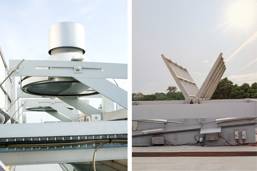 The amount of light directed into Terminal 3 is controlled by movable, perforated butterfly panels mounted above each light well. The position of these panels adjusts according to the sun's angle and current daylight and weather conditions. Roof sensors gather information to control these butterfly panels through a central computer that manages the entire terminal. This allows daylight to enter while blocking direct sunlight. During bad weather and at night, direct lighting takes over: these lights, located on the roof below the butterfly panels, activate gradually as sunlight diminishes, creating a seamless transition for passengers. Both artificial lighting and daylight use the same light deflection systems, keeping the heat from radiant lamps outside the building. This has resulted in savings of approximately 2,400 tons of CO2.