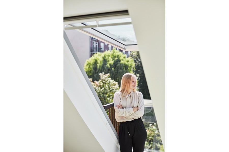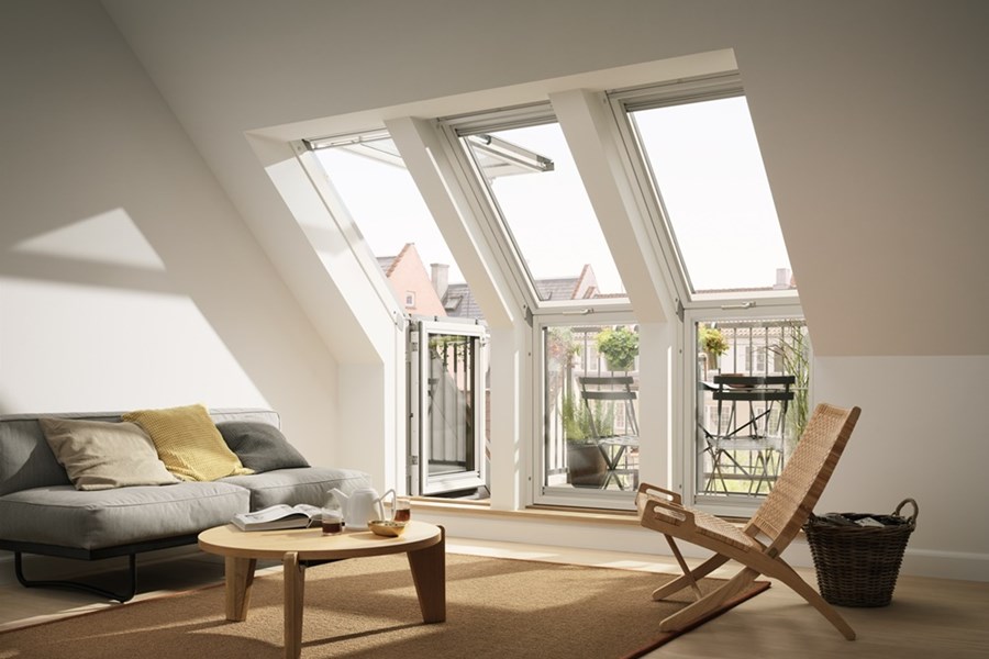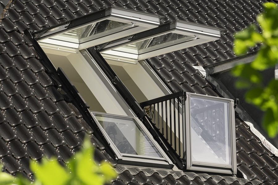 With the VELUX roof balcony system, you can bring daylight to your attic. It can be used as a roof window when you open only the upper wing, and as a balcony when you open both wings together.