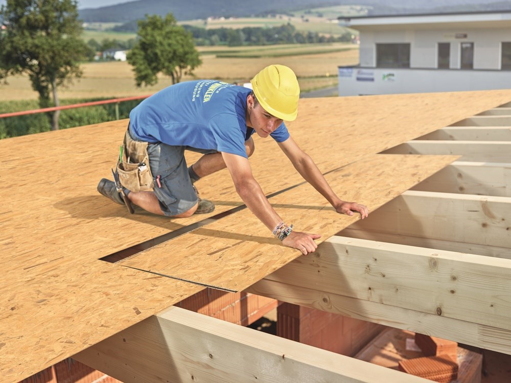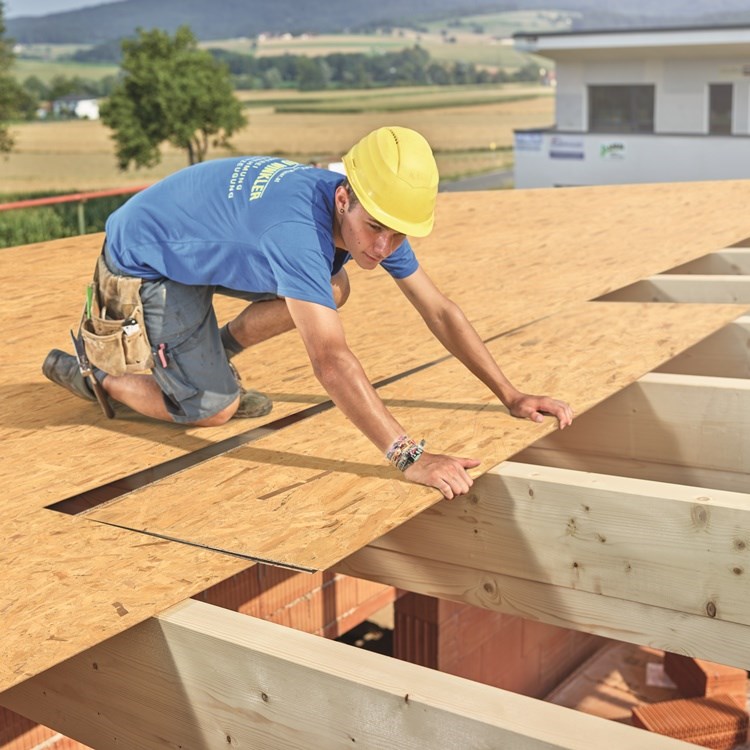 - Vapor-permeable warm roof construction with ventilated bitumen roofing applied over EGGER Roofing Board