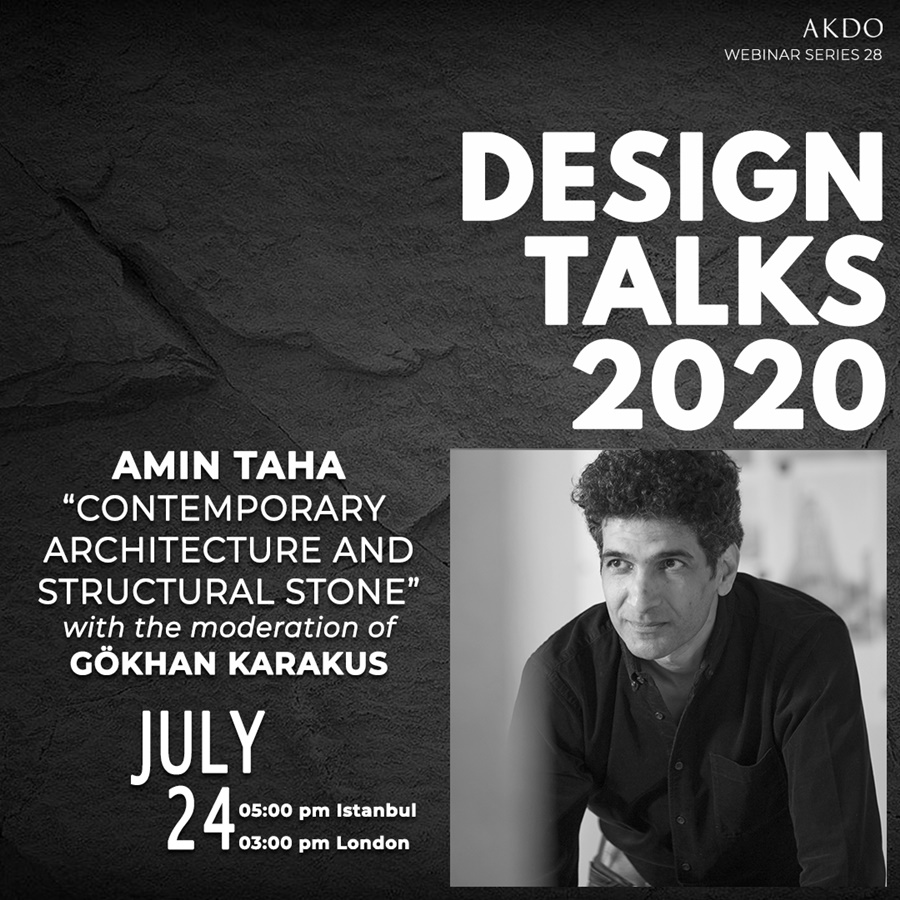 Silkar Madencilik tarafından düzenlenen AKDO 'Online' Tasarım Buluşmaları devam ediyor. 24 Temmuz 2020 Cuma günü İstanbul saati ile 17:00'’da gerçekleşecek Yapı Kataloğu Webinar desteği ile gerçekleştirllecek serinin konukları ‘Contemporary Architecture and Structural Stone’’ başlıklı konuşmaları ile GroupWork+Amin Taha Londra ofisinden mimar Amin Taha ve mimar eleştirmen ve tasarımcı Gökhan Karakuş olacak.