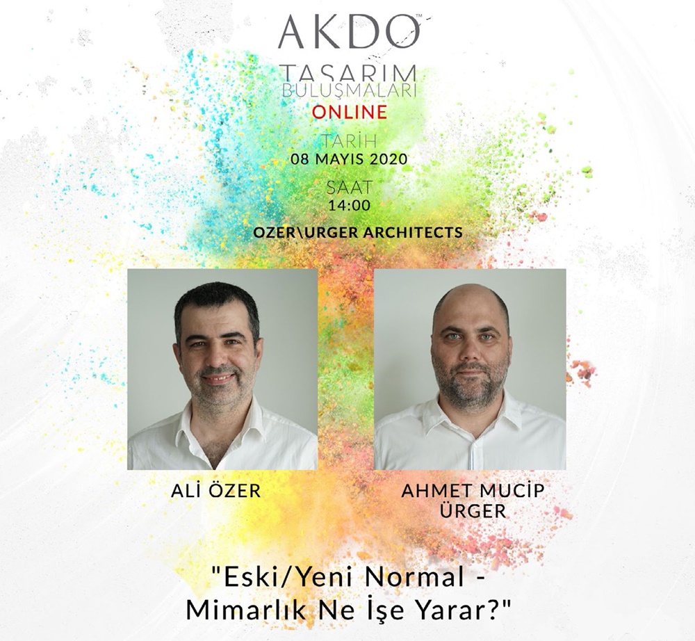 AKDO tarafından düzenlenen “Tasarım Buluşmaları” etkinlikleri ONLINE olarak devam ediyor! 08 Mayıs 2020 Cuma günü saat 14:00’de gerçekleşecek ve Yapı Kataloğu tarafından organize edilen ‘webinar’ etkinliğinin konuğu “Eski/Yeni Normal - Mimarlık Ne İşe Yarar?" başlıklı konuşmalarıyla Özer\Urger Architects’ten Ali Özer ve Ahmet Mucip Ürger olacak.