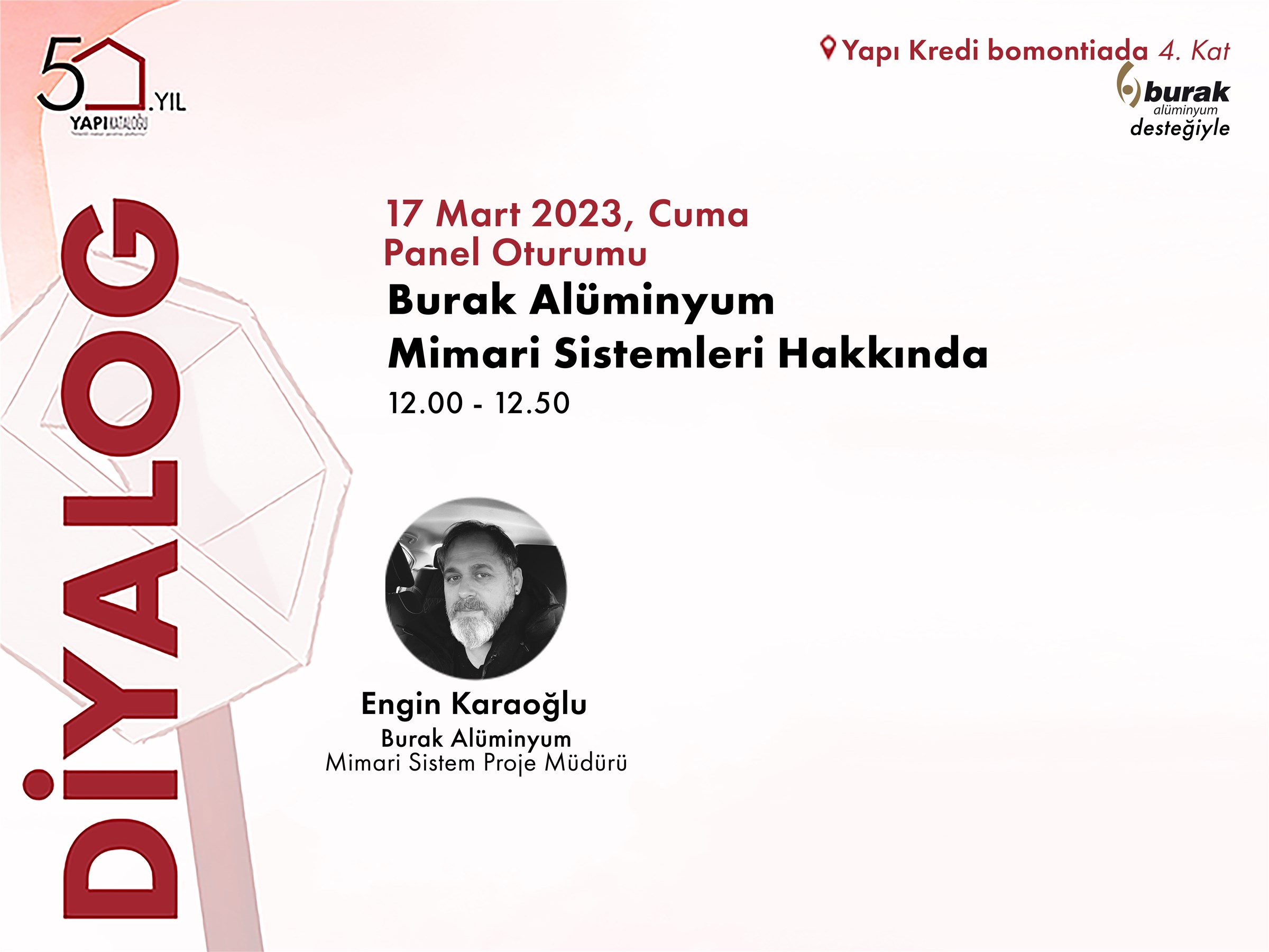 “Diyalog” etkinliği kapsamında Burak Alüminyum’un desteğiyle 17 Mart 2023 Cuma günü saat 12.00-12.50 arasında gerçekleştirilen ve Engin Karaoğlu’nun konuşmacı olarak yer aldığı Burak Alüminyum Mimari Sistemleri Hakkında başlıklı panele ilginize teşekkür ederiz.