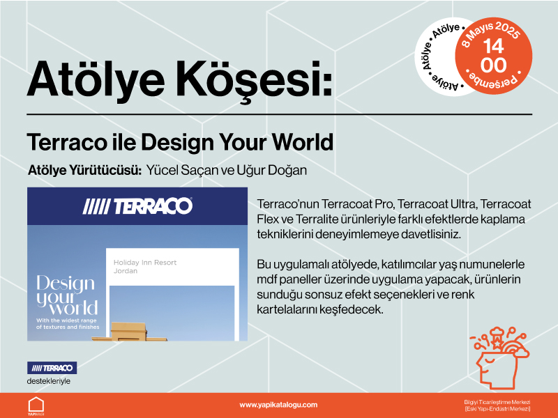 Terraco’nun Terracoat Pro, Terracoat Ultra, Terracoat Flex ve Terralite ürünleriyle farklı efektlerde kaplama tekniklerini deneyimlemeye davetlisiniz. Bu uygulamalı atölyede, katılımcılar yaş numunelerle mdf paneller üzerinde uygulama yapacak, ürünlerin sunduğu sonsuz efekt seçenekleri ve renk kartelalarını keşfedecek.