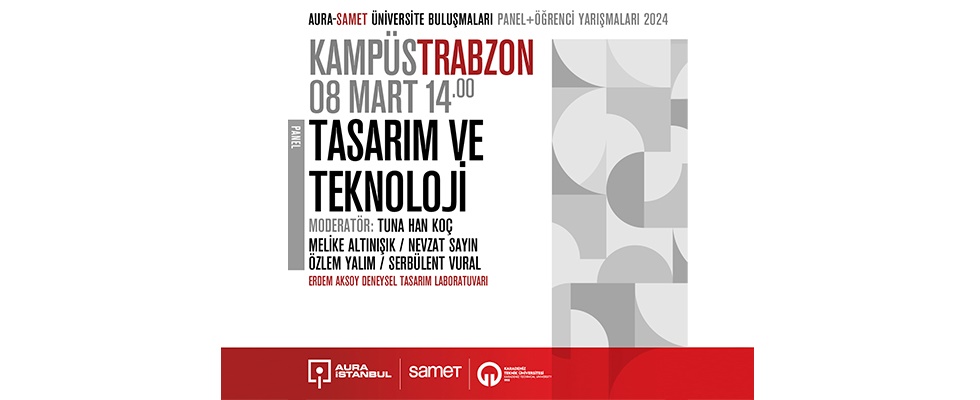 Türkiye’nin beş farklı şehrinde tasarıma ilgi duyan öğrenciler ile düzenlenecek panel ve yarışmalar serisinin ilki 8 Mart’ta Trabzon Karadeniz Teknik Üniversitesi’nde gerçekleşti. Farklı disiplinlerden profesyonellerin ve akademisyenlerin katılımı ile kentlere dair güncel tartışmaların gerçekleşeceği panellerin ilkinde “Tasarım ve Teknoloji” konuşuldu. Tuna Han Koç moderatörlüğünde gerçekleşen panelde Nevzat Sayın, Melike Altınışık, Özlem Yalım ve Serbülent Vural konuşmacı olarak yer aldı.