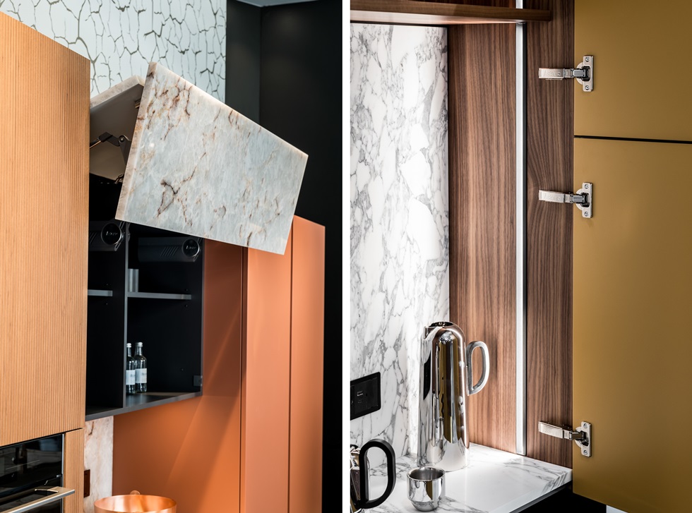 İster ahşap veya seramik ister taş görünüm olsun; karakteri güçlü ve doğal görünümlü malzemeler, 2024’e damgasını vuruyor. Blum’un çözümleri; AVENTOS kalkar kapak sistemleri ya da menteşeler, farklı malzemeler için de ideal kullanım imkanı sağlıyor.