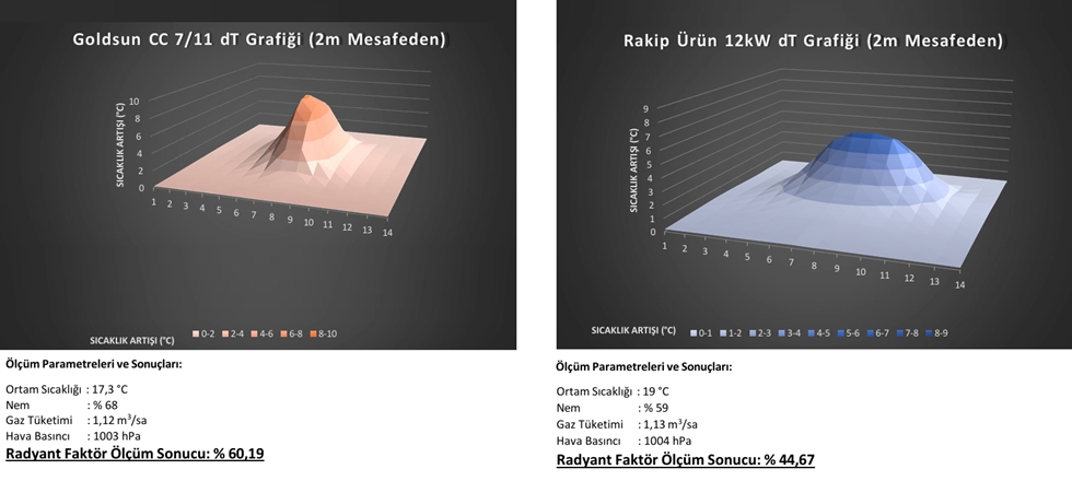 GOLDSUN CC’nin radyant verimi yüzde 60,19 iken, rakip firma ürününün yüzde 44,67 olduğu; GOLDSUN CC’nin 1 kW radyant ısı üretmek için 1,66 kW, rakip firma ürününün ise 2,23 kW enerji harcadığı görüldü.