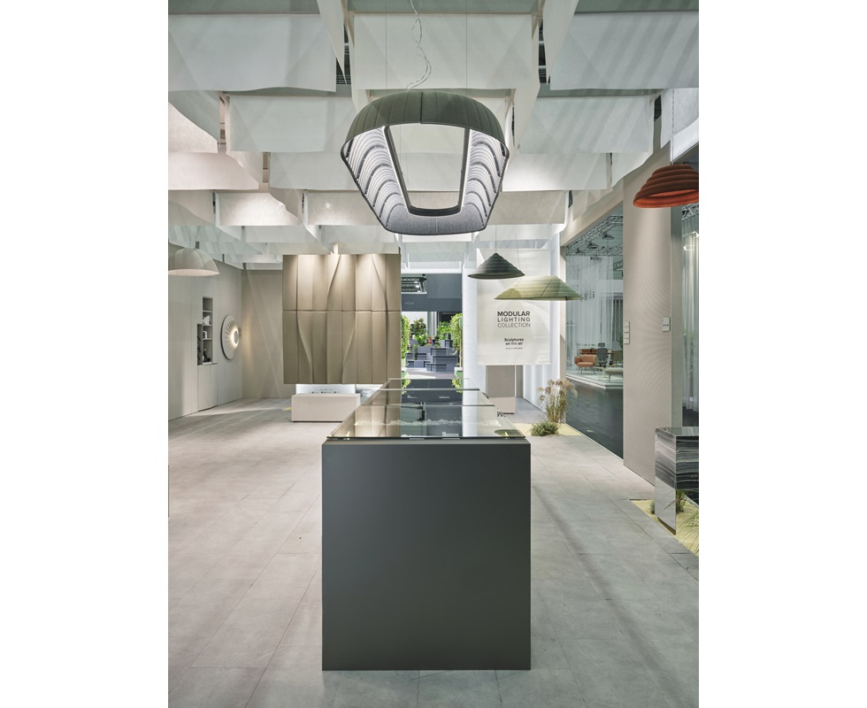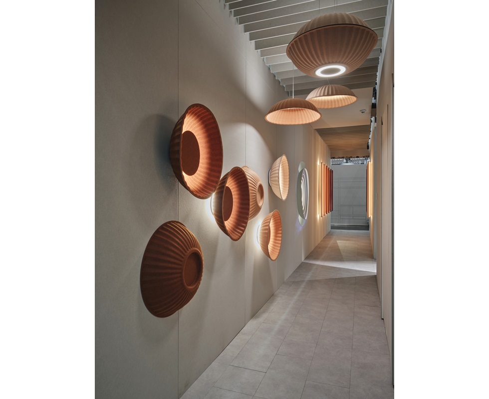 Ünlü Danimarkalı formlu keçe tasarımcısı Boris Berlin tarafından Feltouch için özel olarak tasarlanan Step ve Segment modüler akustik aydınlatma sistemleri, Orgatec 2024'te ilk kez sergilendi. Step Modüler aydınlatma, “basamaklı koni” şekli ile ışık konisinin görüntüsüne atıfta bulunurken; Segment Modüler aydınlatma, “Pantheon’un kubbesi gibi üstte açıklığı olan “kubbe” şekli görünür bir ışık kaynağı olmadan odada ilginç bir “boş” kubbe yaratır. %50 geri dönüştürülmüş PET keçeden üretilen bu sistemler hem ışığı yansıtan hem de çınlama seviyelerini aşağıda çeken özelliklere sahiptir ve modüler yapıları çeşitli iç mekân ihtiyaçlarına uyum sağlıyor.