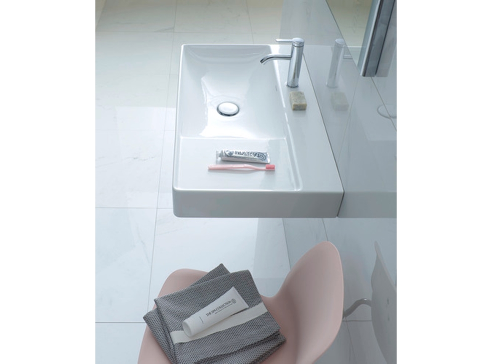 Sağda veya solda geniş yüzey alanlarına sahip geniş bir lavabo, tüm temel ihtiyaçlara kolayca ulaşılabildiği için günlük yaşamda pratik avantajlar sunar. DuraSquare lavabosunun dikdörtgen tasarımı, iki kişinin aynı anda rahatça dişlerini fırçalayabilmesi için bolca alan sunar.