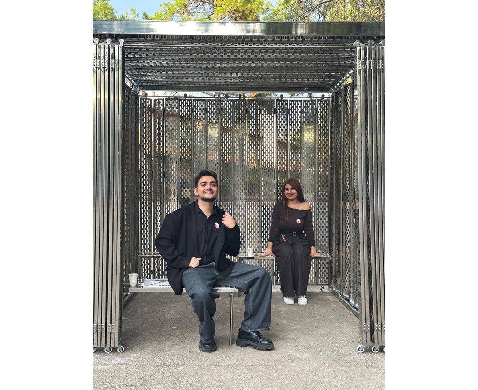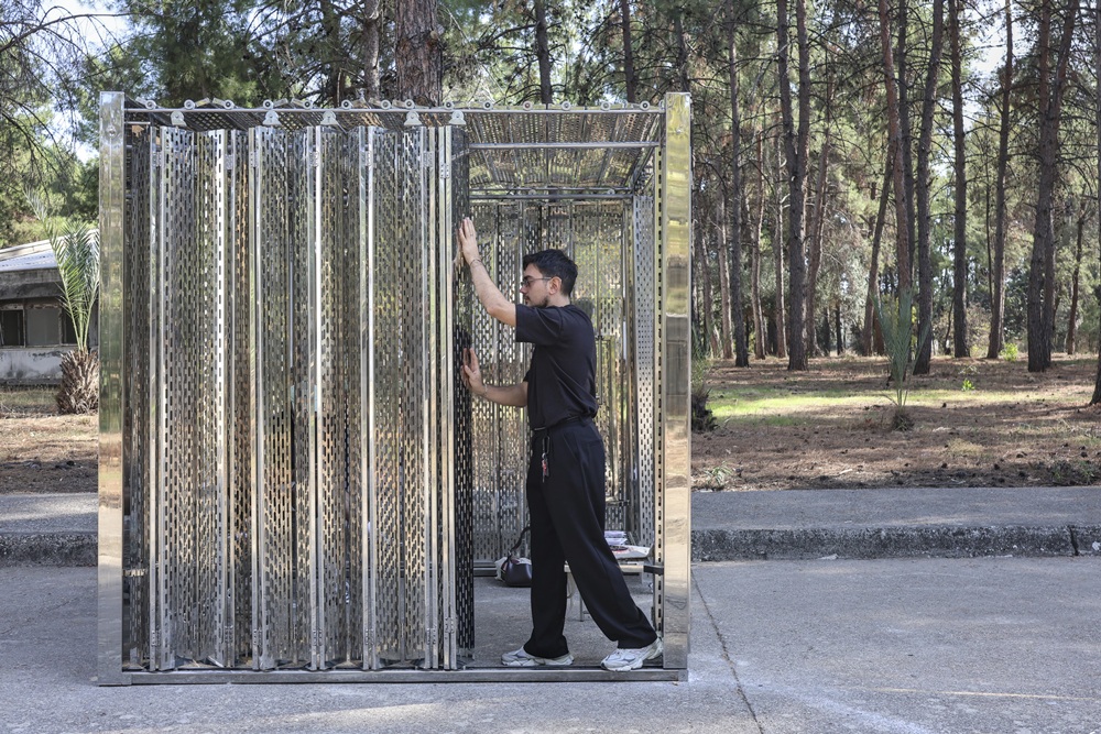 Yarı geçirgen ve yansıtıcı özel kesim krom mesh paneller ile üretilen strüktür; içeriden dışarıyı gösterirken, dışarıdan çevreyi yansıtarak mekânı aynı anda hem görünür hem görünmez kılıyor. Bu çift yönlü deneyim, yapının temelindeki “arada olma” hâlini güçlendiriyor.