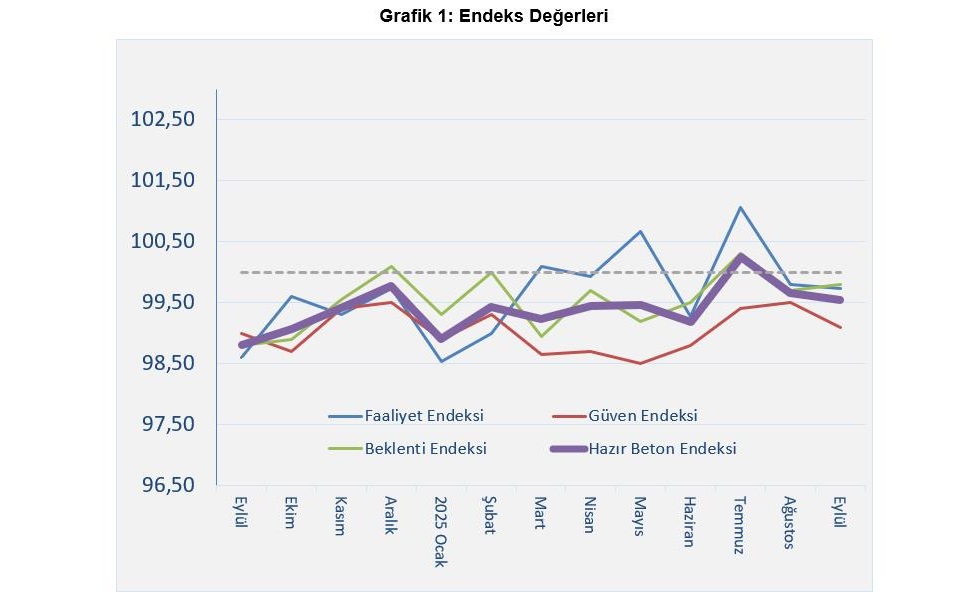 Hazır Beton Endeksi 2025 Eylül Ayı Raporu’na göre, temmuz ayındaki zirveden sonra ağustosta eşik değerin altına gerileyen Faaliyet Endeksi, eylül ayında eşik değerin altındaki yatay hareketine devam etmiştir. Beklenti ve Güven Endekslerinin her ikisi de yine negatif tarafta hareket etmiştir. Beklentide görülen sınırlı artış, endeks değerini eşiğin üzerine taşımaya yeterli olmamıştır. Güven Endeksi ise eylül ayında gerilemiş görünmektedir. Son olarak birleşik Beton Endeksi de Güven Endeksi’ndeki azalışa paralel olarak düşüş kaydetmiştir.